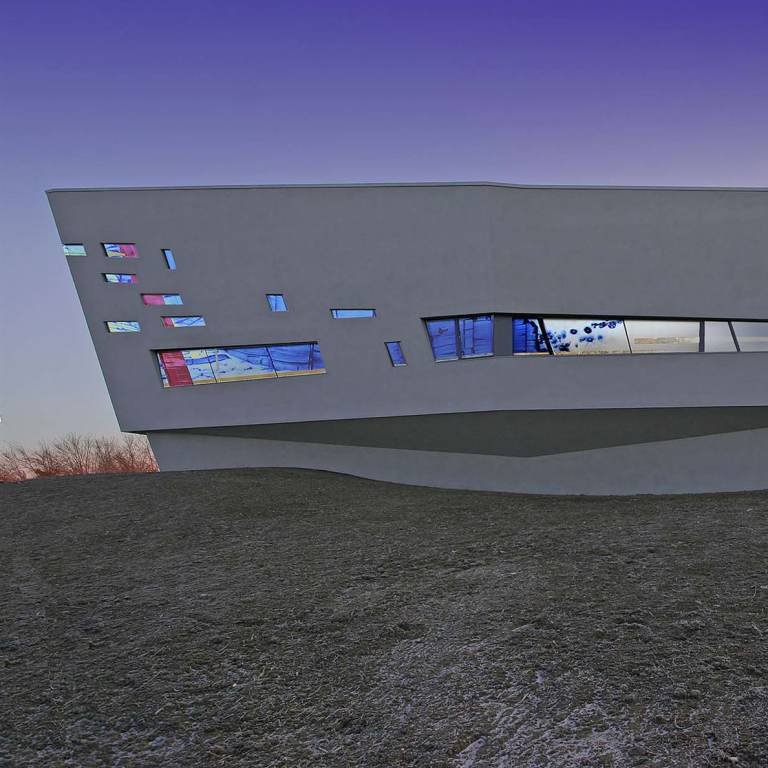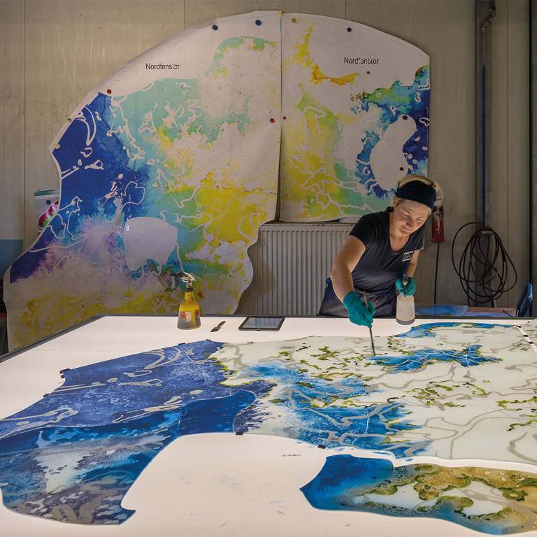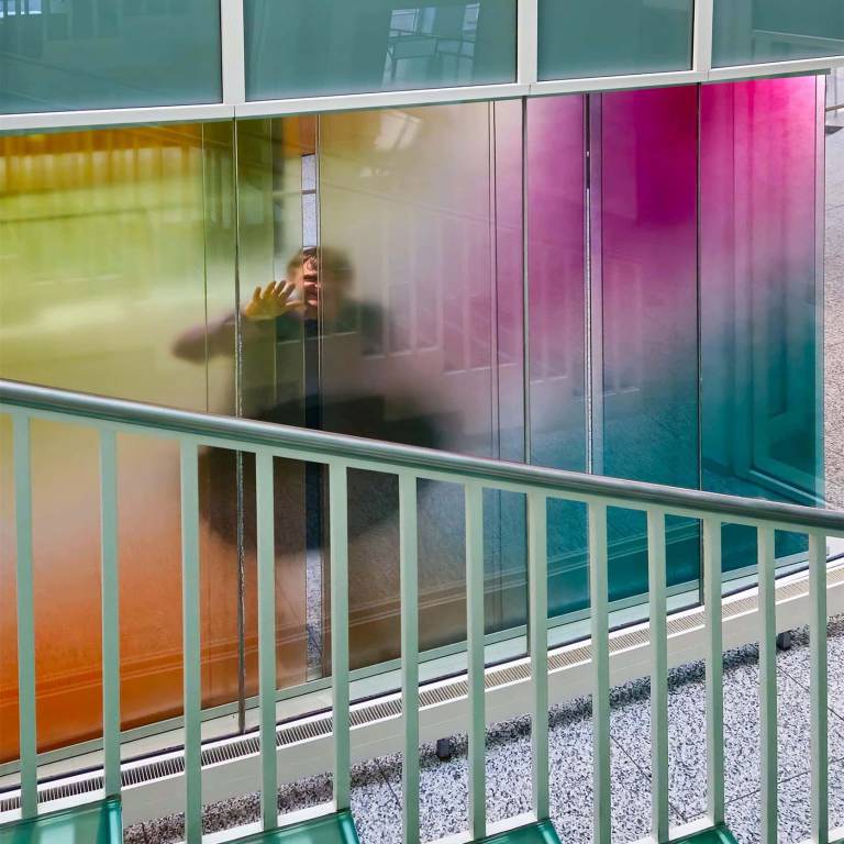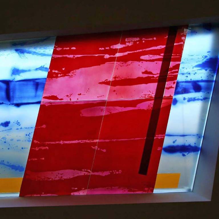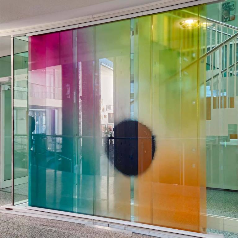 Beschreibung: Ein mäandrierendes Netz aus utopischen topografischen Strukturen verschmilzt zu einer imaginären Landschaft. Die Wechselwirkung von Licht, mehrschichtiger, emaillierter Farbigkeit und Transparenz spielt mit der Wahrnehmung der Betrachtenden. Verbundsicherheitsglas mit innenliegenden keramischen, eingebrannten Farben.