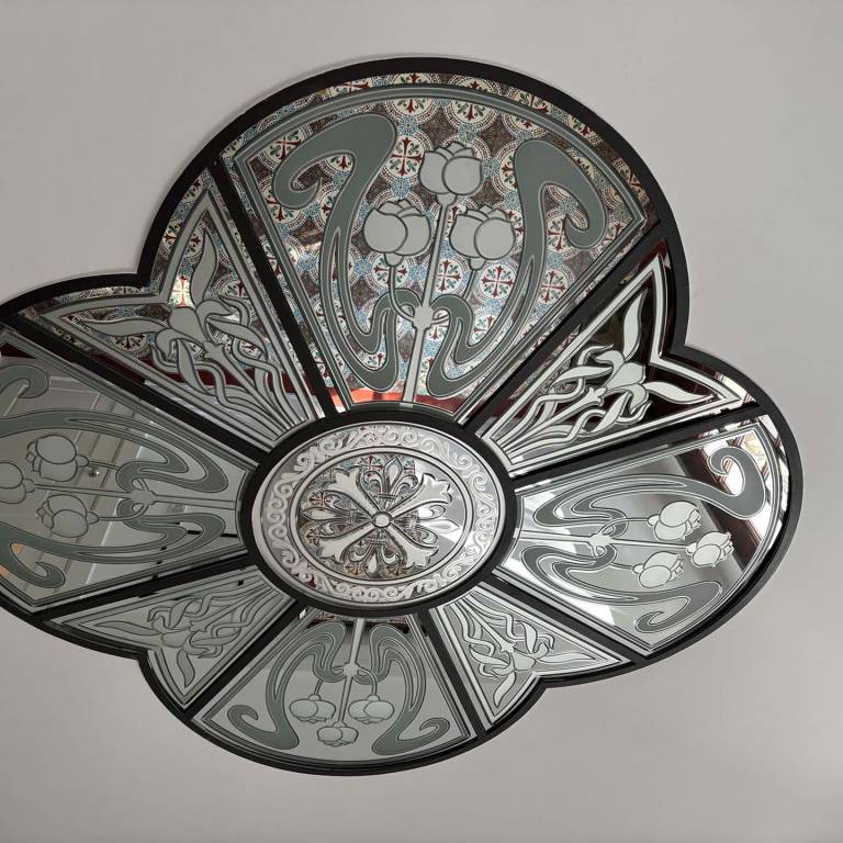 Technik: Verwendung von Floatglas, verformt und mit keramischer Farbe bemalt und vergoldet als Fensterglas für denkmalgestütztes Gebäude.