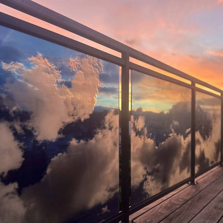 Technik: Deckenleuchte ist aus sandgestrahlten Spiegelgläsern. Die Balkonverkleidung aus digital gedruckten Sicherheitsgläsern.