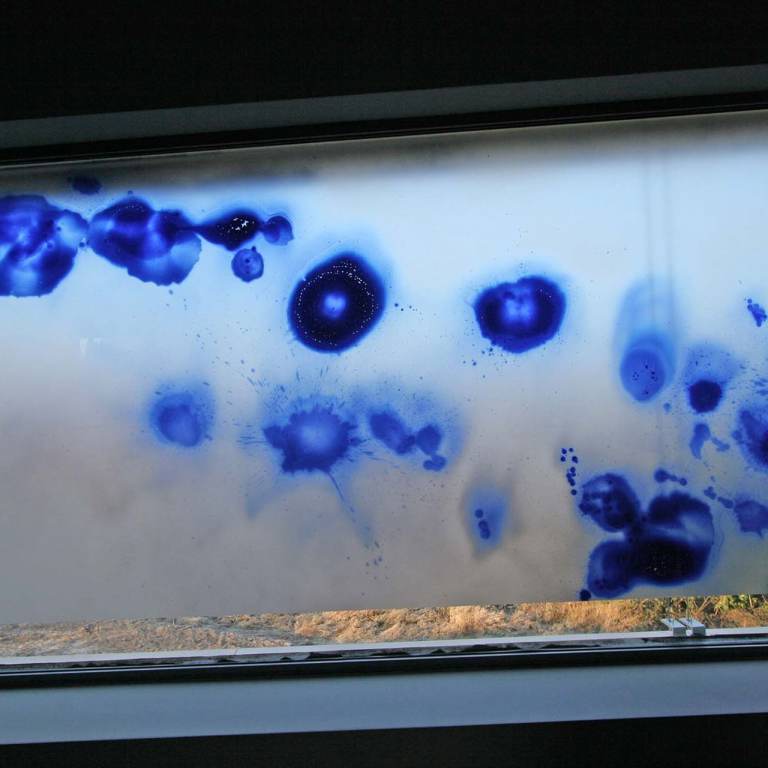 Technik: Glasmalerei mit Silberbeize im Verlauf und rückseitiger partieller Sandstrahlung, Weiterverarbeitung zu Sicherheitsglas und vorderseitig aufgeklebten transparenten Halbkugeln in diversen Abmessungen.
