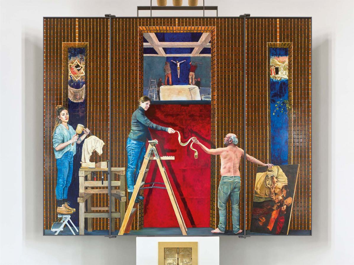 Auftraggeber: Kath. Kirchengemeinde St. Clemens, Drolshagen Architekt: Architekturbüro Clemens und Maas Fotos: Thomas Jessen Technik: Malerei mit Schwarzlot, Zuschnitt verschiedener Echt-Antikgläser, auflaminiert auf Sicherheitsglas.