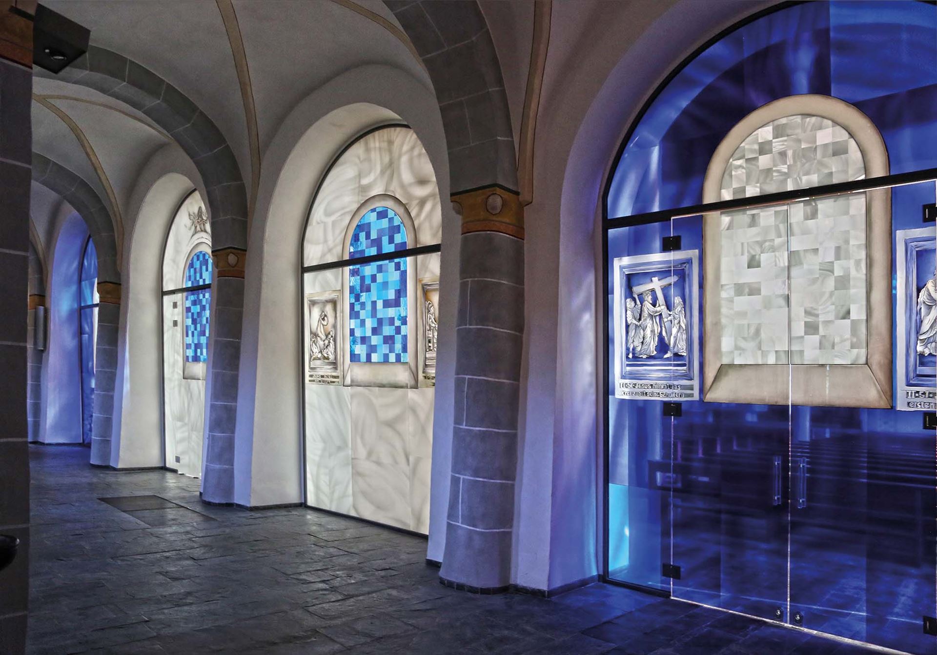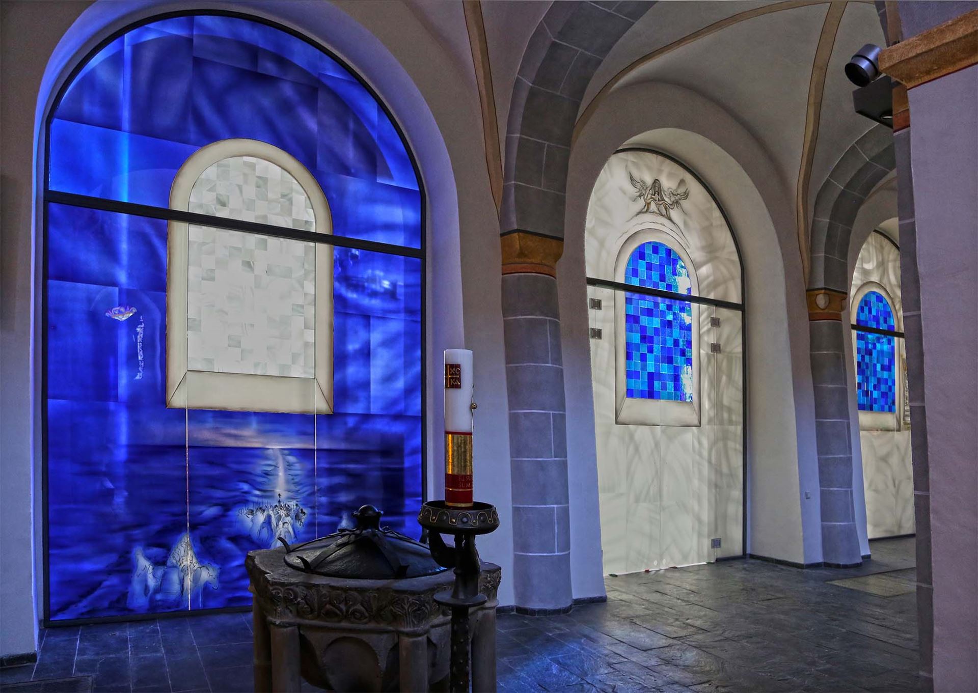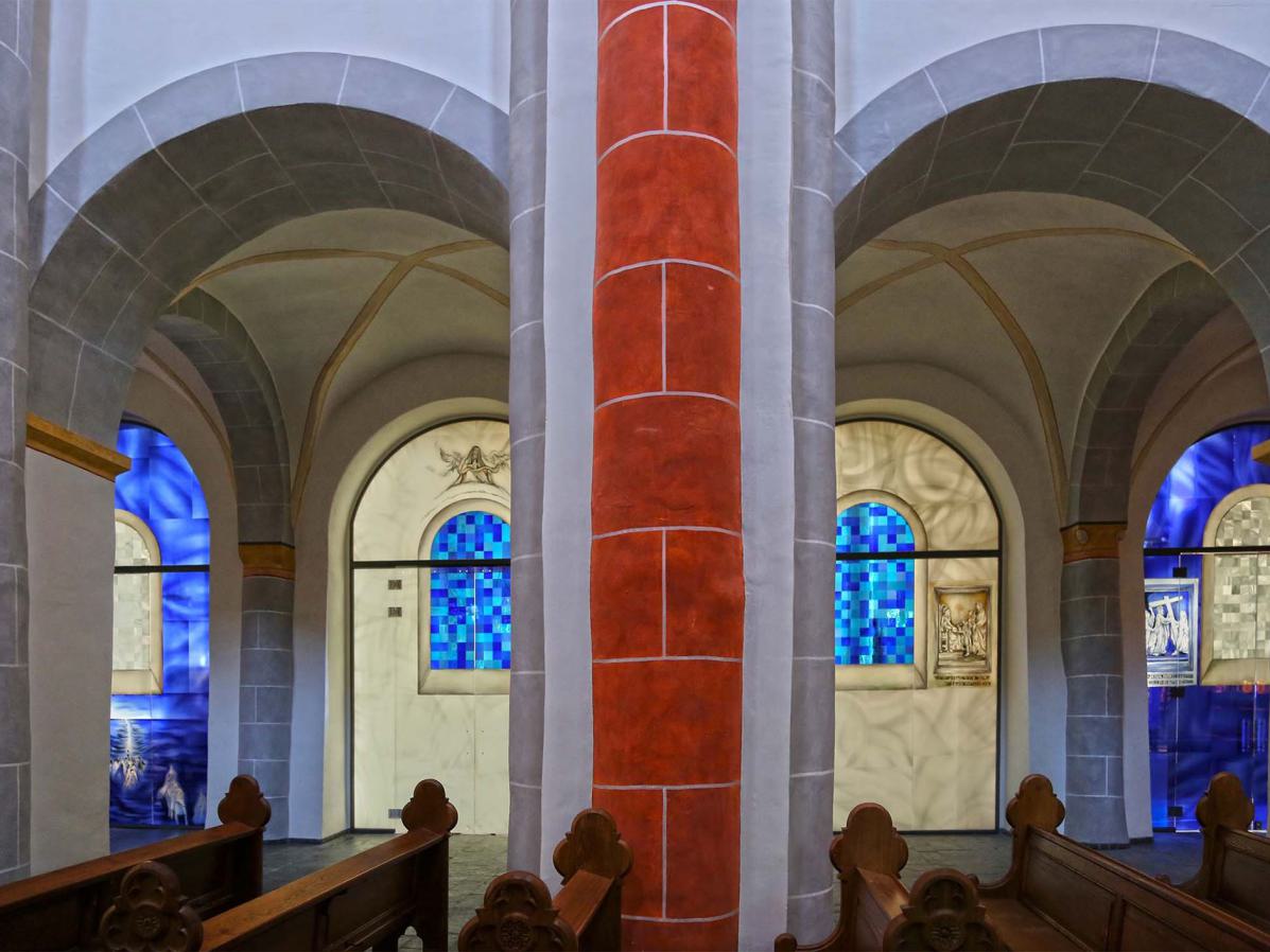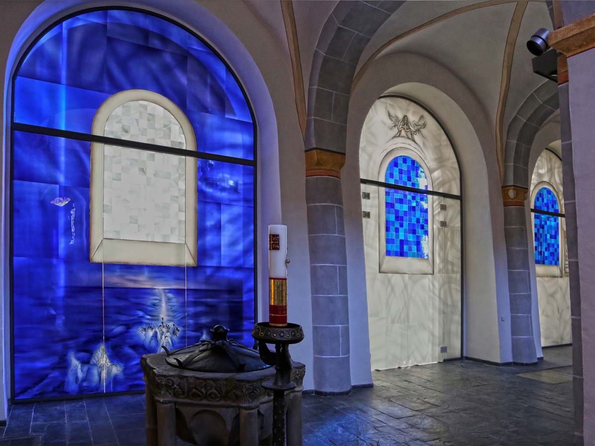 Beschreibung: Die Glaswände zeigen die bei der Erweiterung der romanischen Kirche entfernte Wand. Auch die damals mit zerstörten Stein-Kreuzwegstationen finden auf dem Glas als Malerei wieder ihren alten Platz. Am alten Taufstein erkennt man in Kinder-Augen-Höhe den Durchzug durch das rote Meer. Der Altar zeigt die Gürtelspende Marias an Thomas und die Hl. Veronika.