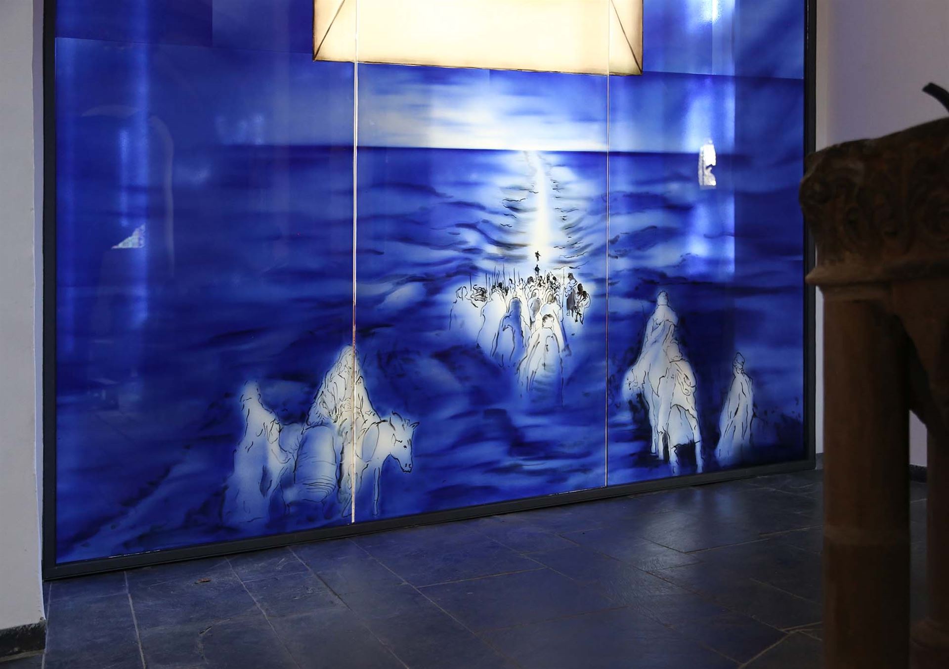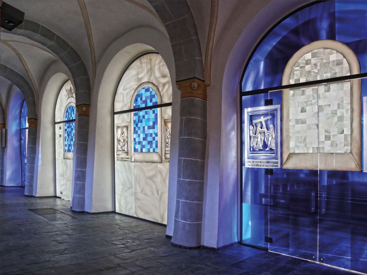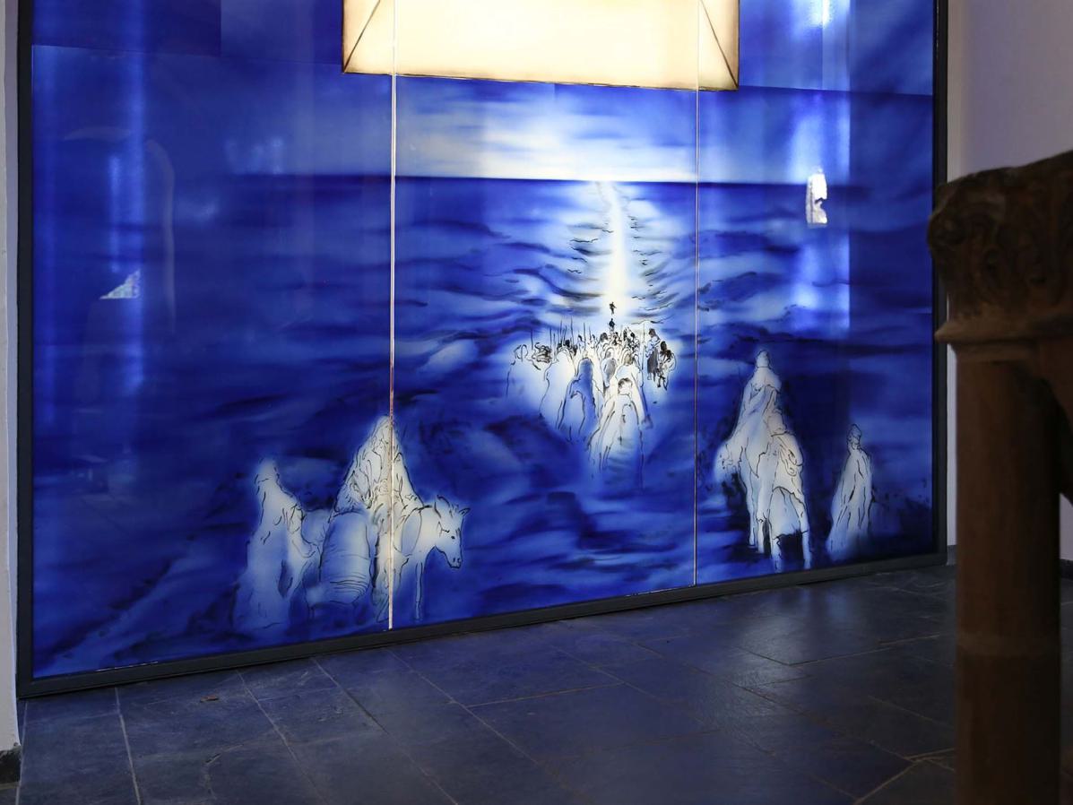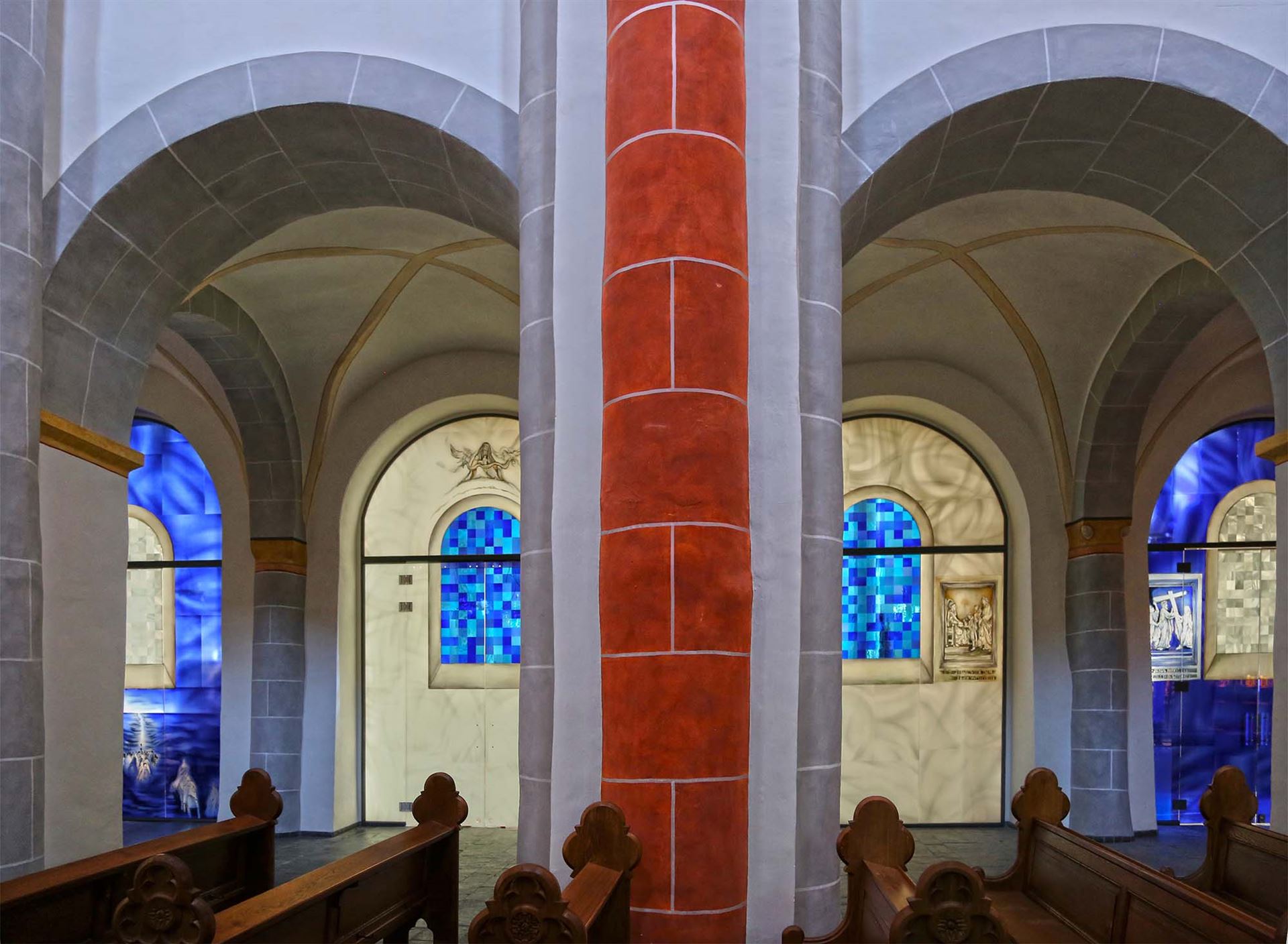 Beschreibung: Die Glaswände zeigen die bei der Erweiterung der romanischen Kirche entfernte Wand. Auch die damals mit zerstörten Stein-Kreuzwegstationen finden auf dem Glas als Malerei wieder ihren alten Platz. Am alten Taufstein erkennt man in Kinder-Augen-Höhe den Durchzug durch das rote Meer. Der Altar zeigt die Gürtelspende Marias an Thomas und die Hl. Veronika.