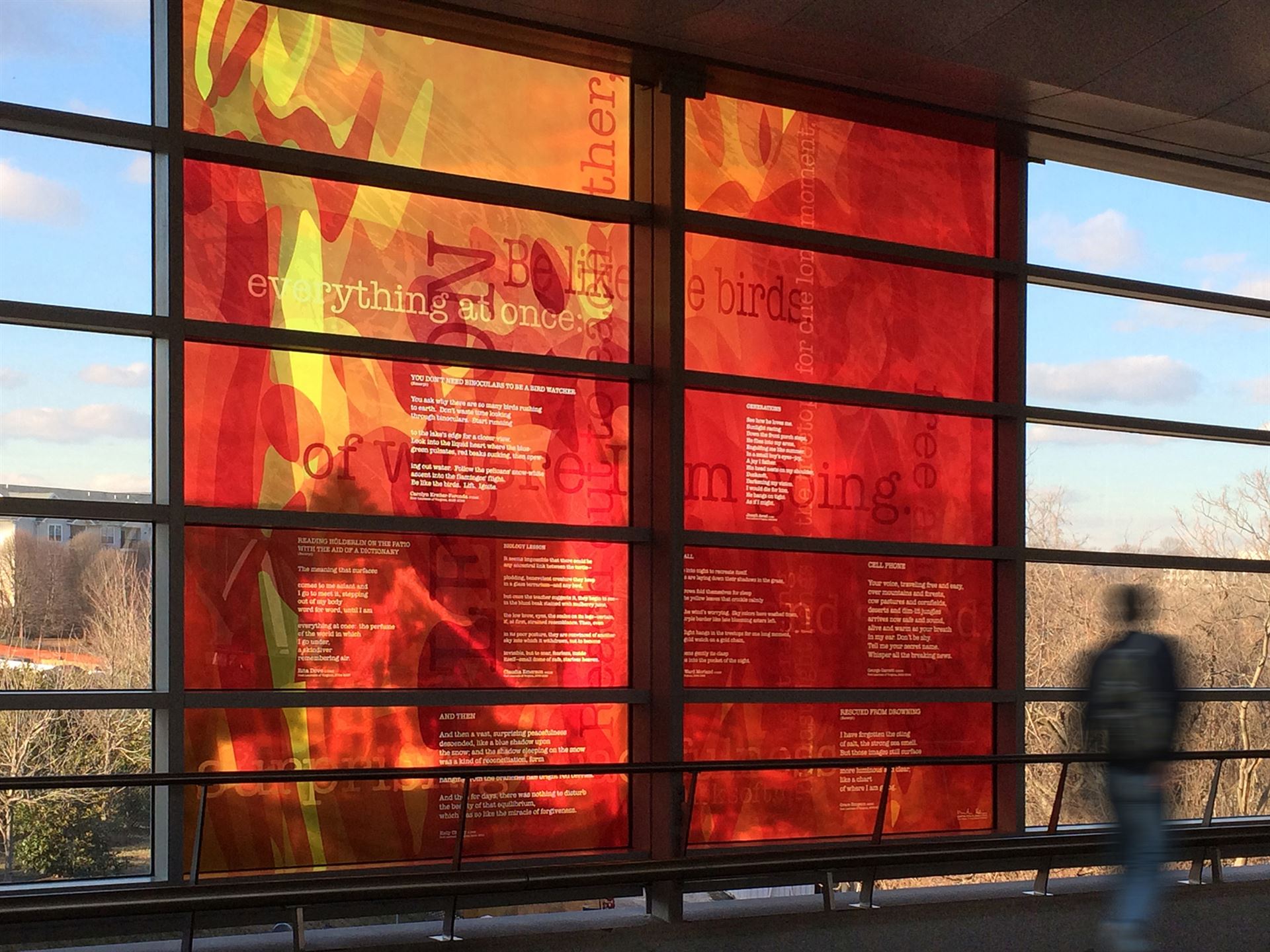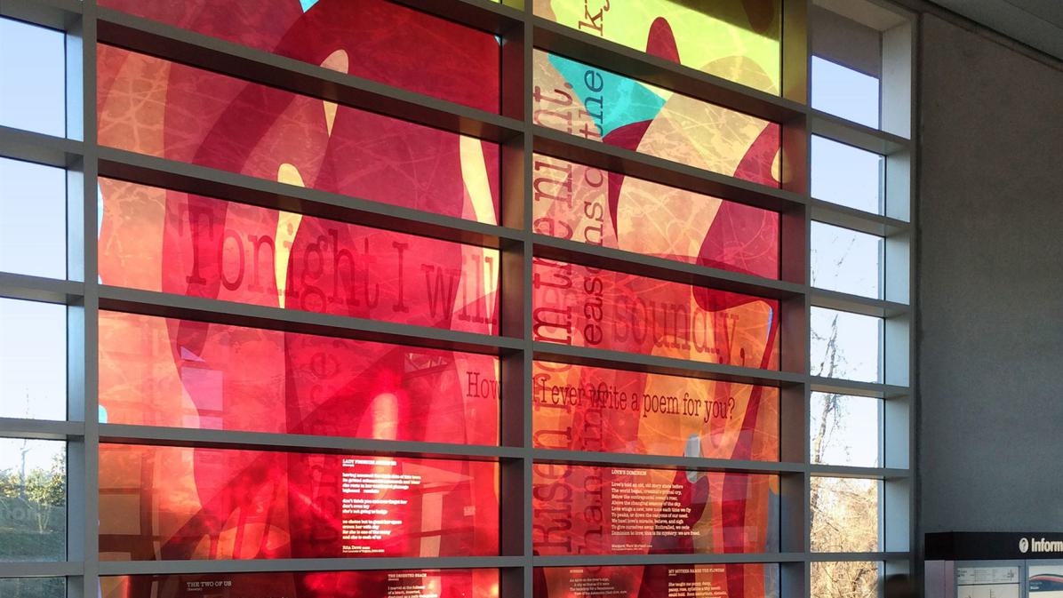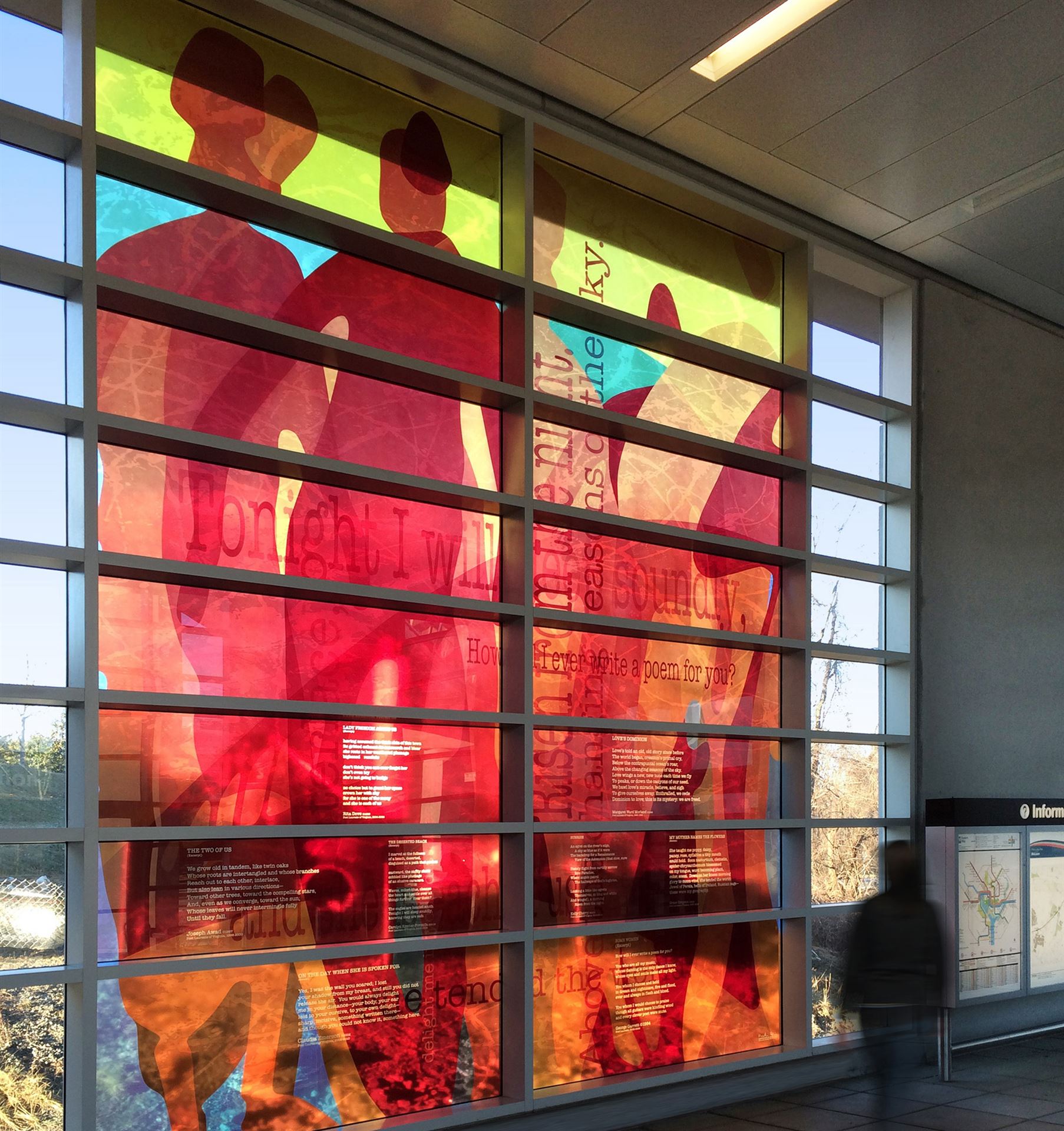 Beschreibung: Die McLean Metro Station ist eine neue Station der Washington Metro Silver Line, die vom Stadtzentrum zum Flughafen Washington Dulles Airport führt.„Voyagers“ steht sowohl für die physische als auch für die kognitive Idee des Reisens und Transportierens. Große menschliche Figuren, die eine Gemeinschaft im Wandel darstellen, sind mit Gedichten von ehemaligen und aktuellen Poeten Laureaten aus Virginia überlagert.