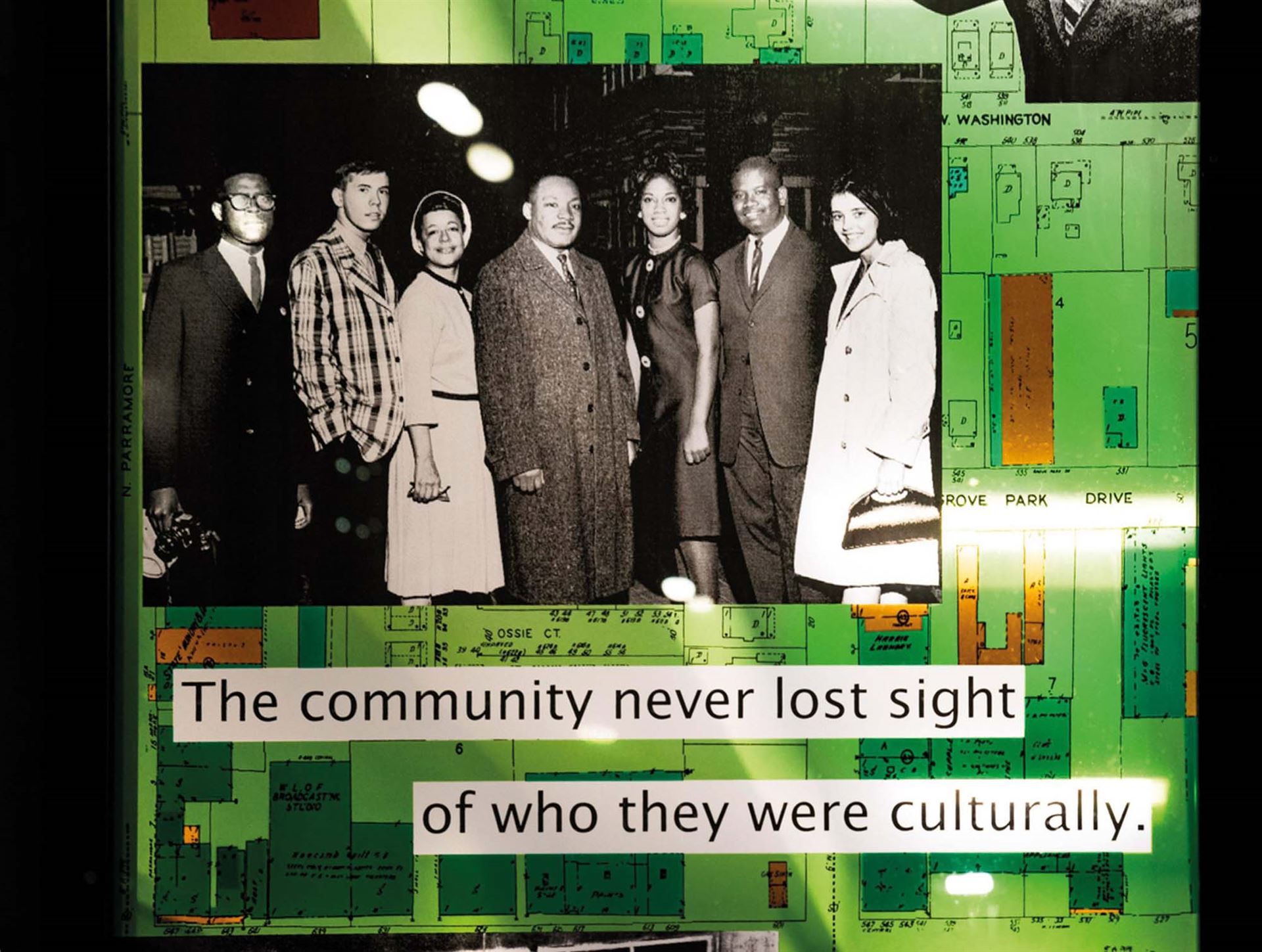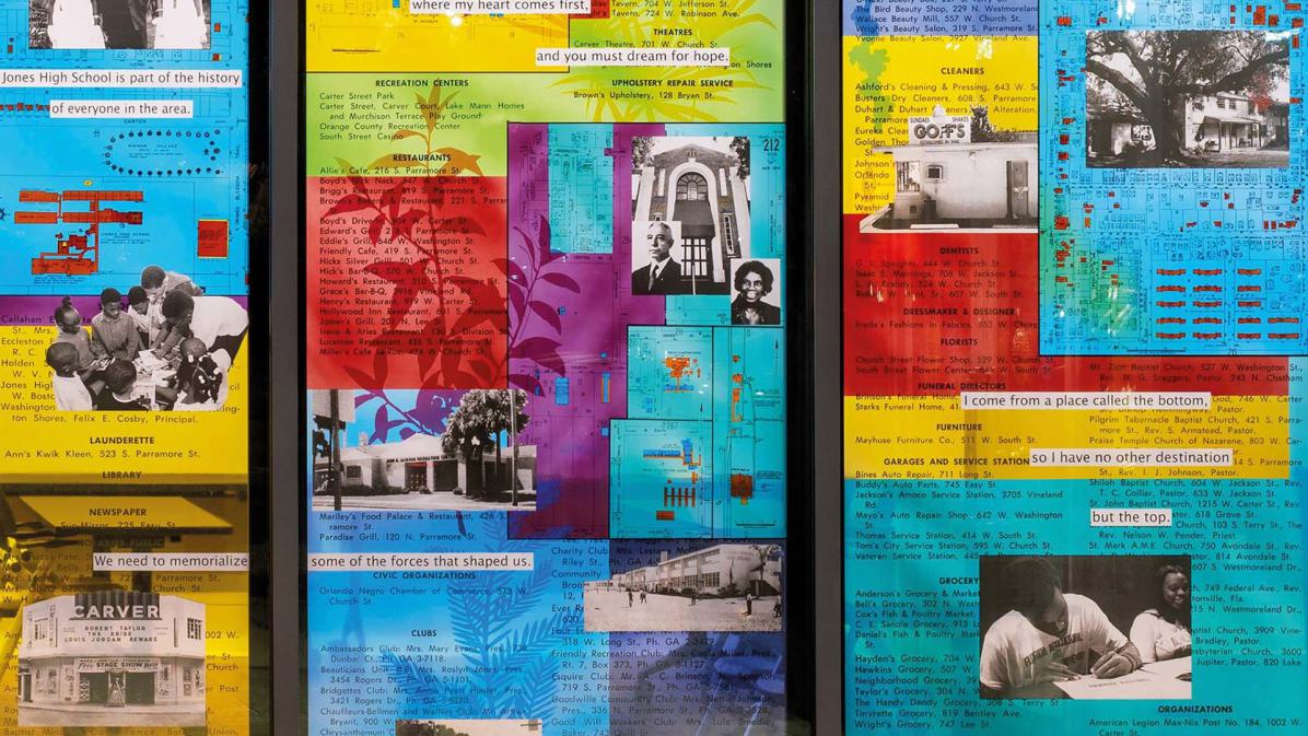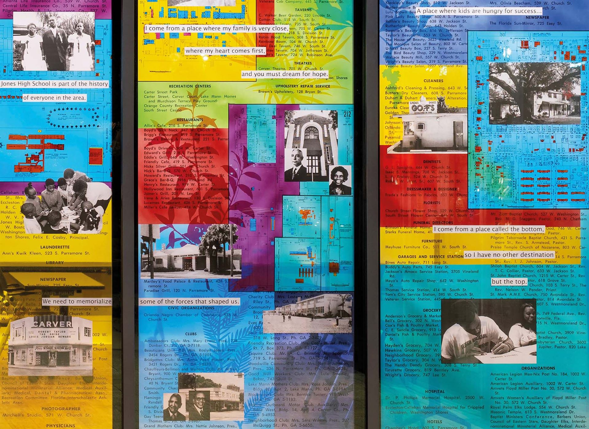 Der Entwurf umfasst historische und zeitgenössische Fotos, Zitate von Bewohnern, Auszüge aus Gedichten von jungen Menschen aus der Gegend, Sanborn-Karten der Gegend aus dem Jahr 1956, Auflistungen aus der Broschüre der Orlando Negro Chamber of Commerce von 1960 und lokale Pflanzen aus der Zeit, als die Gegend noch hauptsächlich aus Zypressensümpfen bestand.