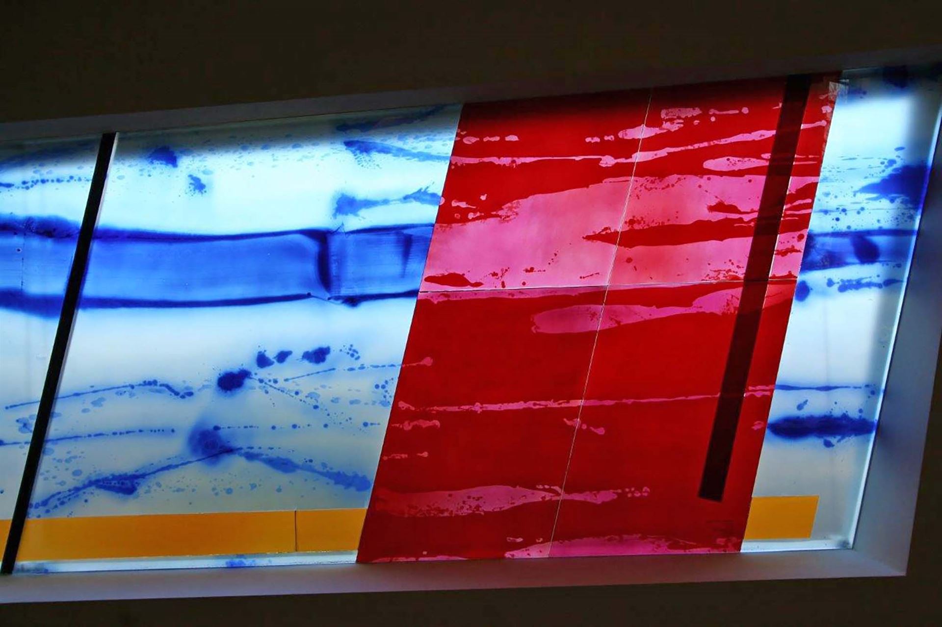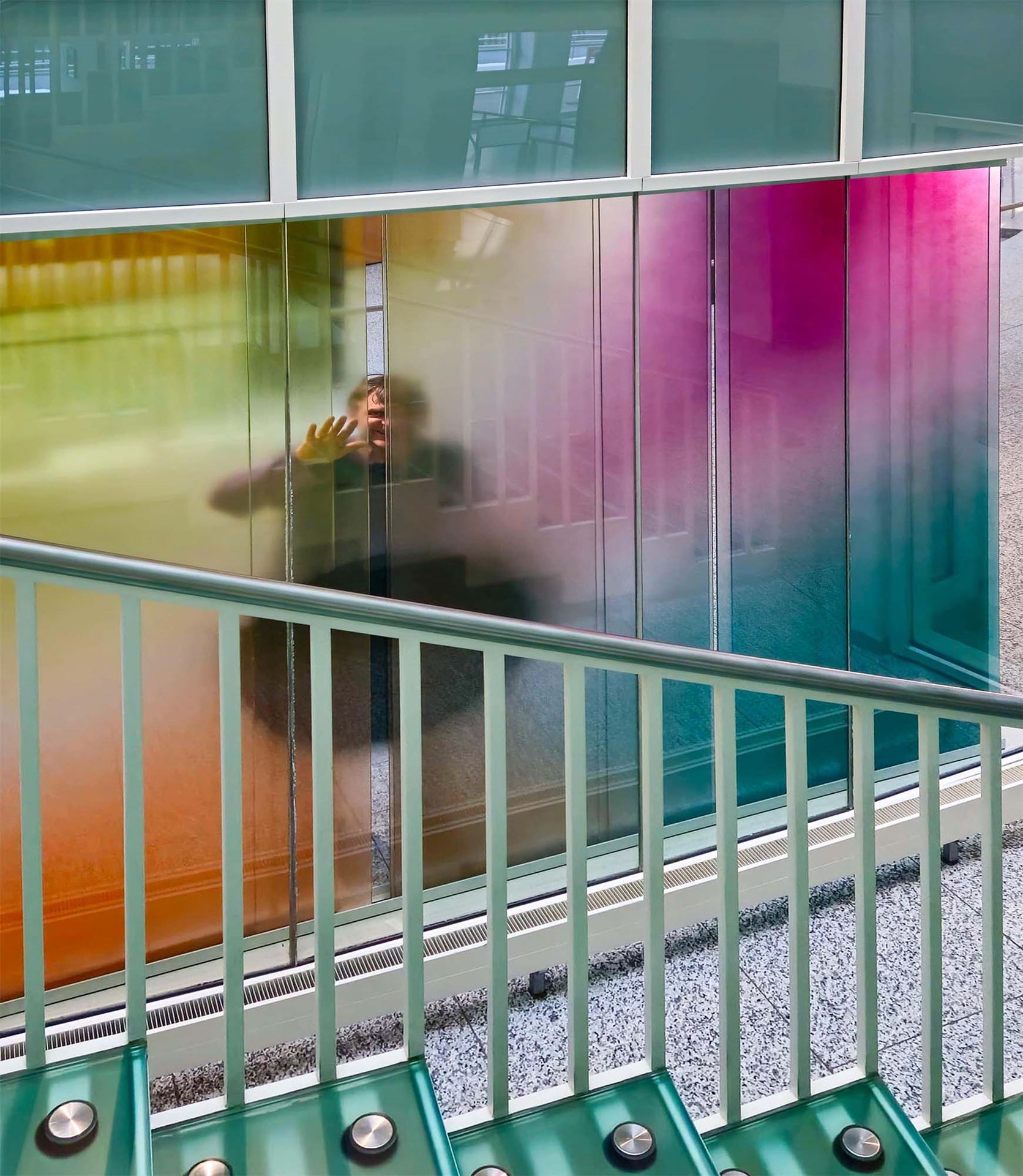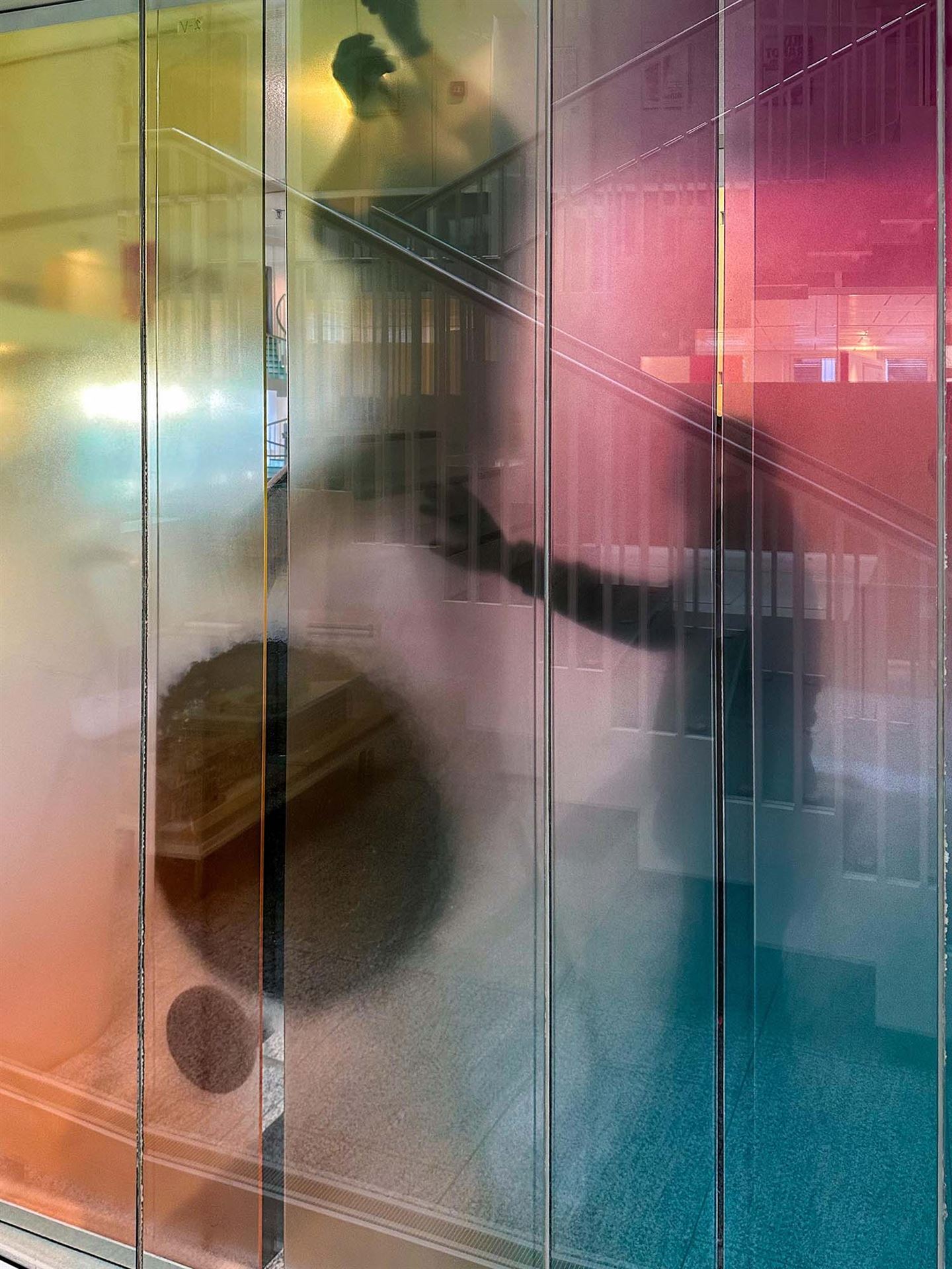 Beschreibung: Ein mäandrierendes Netz aus utopischen topografischen Strukturen verschmilzt zu einer imaginären Landschaft. Die Wechselwirkung von Licht, mehrschichtiger, emaillierter Farbigkeit und Transparenz spielt mit der Wahrnehmung der Betrachtenden. Verbundsicherheitsglas mit innenliegenden keramischen, eingebrannten Farben.