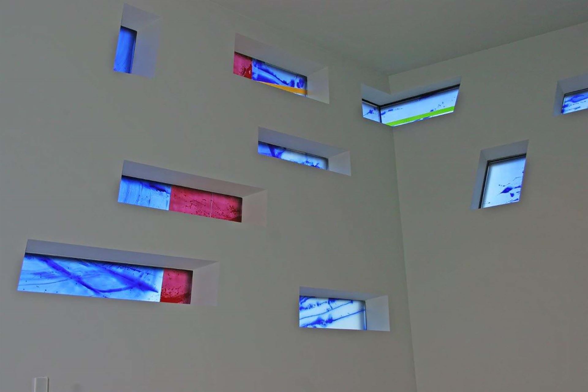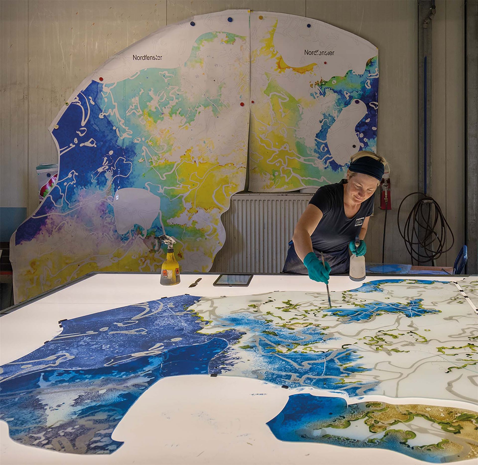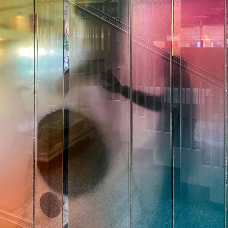 Beschreibung: Ein mäandrierendes Netz aus utopischen topografischen Strukturen verschmilzt zu einer imaginären Landschaft. Die Wechselwirkung von Licht, mehrschichtiger, emaillierter Farbigkeit und Transparenz spielt mit der Wahrnehmung der Betrachtenden. Verbundsicherheitsglas mit innenliegenden keramischen, eingebrannten Farben.