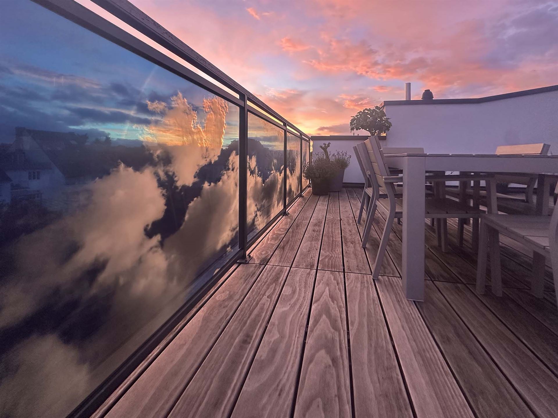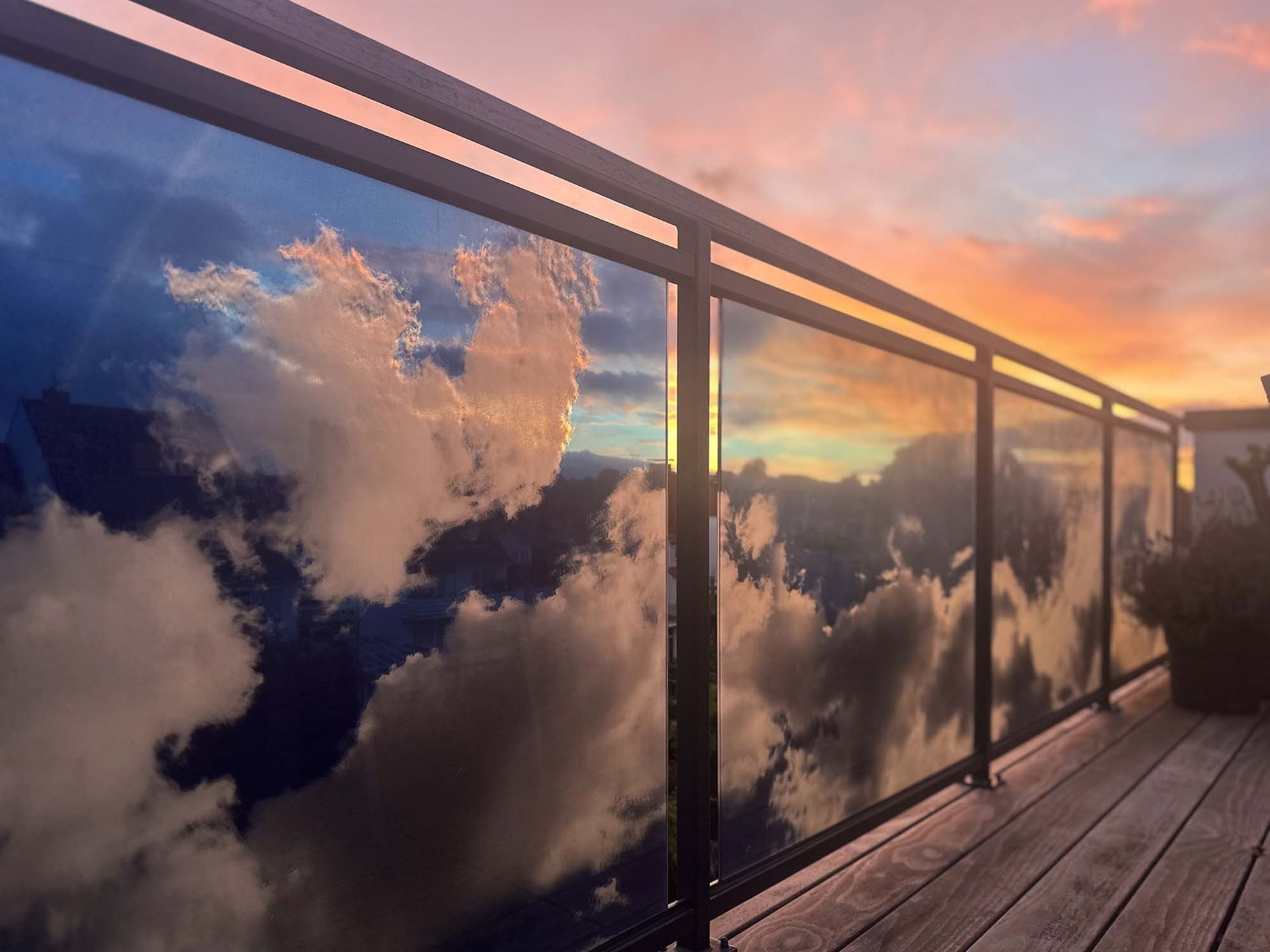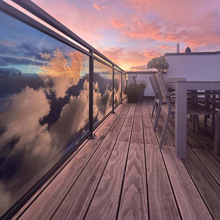 Technik: Deckenleuchte ist aus sandgestrahlten Spiegelgläsern. Die Balkonverkleidung aus digital gedruckten Sicherheitsgläsern.
