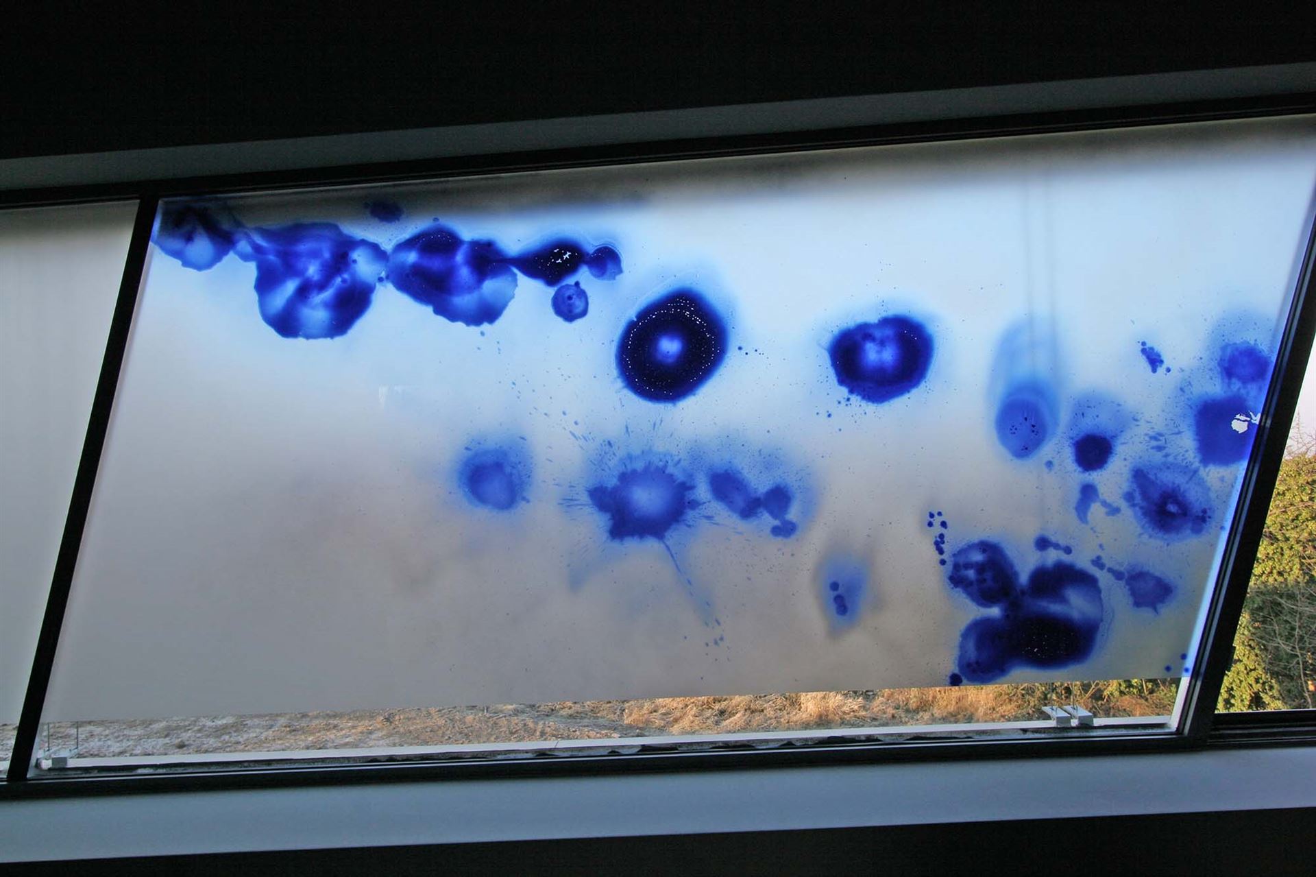 Technik: Glasmalerei mit Silberbeize im Verlauf und rückseitiger partieller Sandstrahlung, Weiterverarbeitung zu Sicherheitsglas und vorderseitig aufgeklebten transparenten Halbkugeln in diversen Abmessungen.
