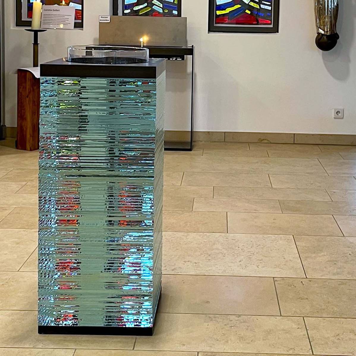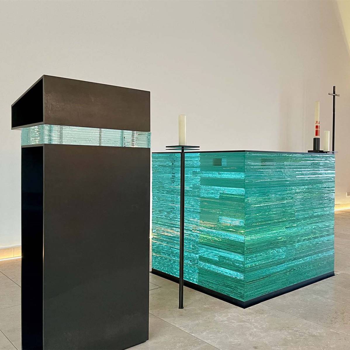 Eingefasst werden die Glaskörper durch zwei Schichten schwarzen Stahls, die Altarplatte mit eingravierten Weihekreuzen sowie die Aufnahme für die gläserne Taufschale und das Weihwasserbecken.