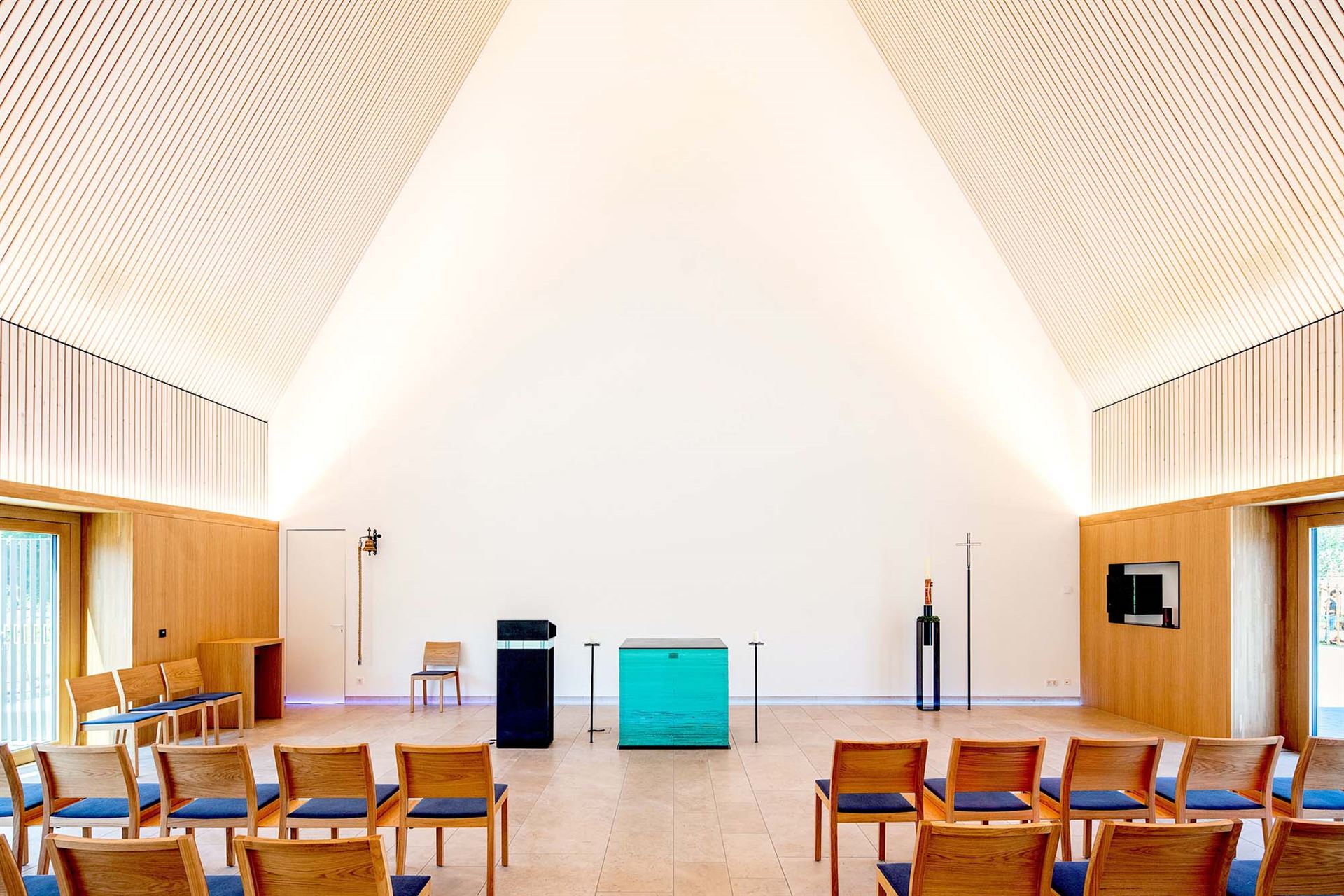 Diese Glaskörper nehmen jeden Lichtstrahl auf und brechen ihn vielfach. Wie eine Wasserfläche im Sonnenlicht schimmern sie und spiegeln Reflexe in den Raum. Im Altar zeigt sich eine Binnenfigur: ein Kreuzzeichen, das durch die unterschiedlichen Formate der Glasscheiben entsteht.