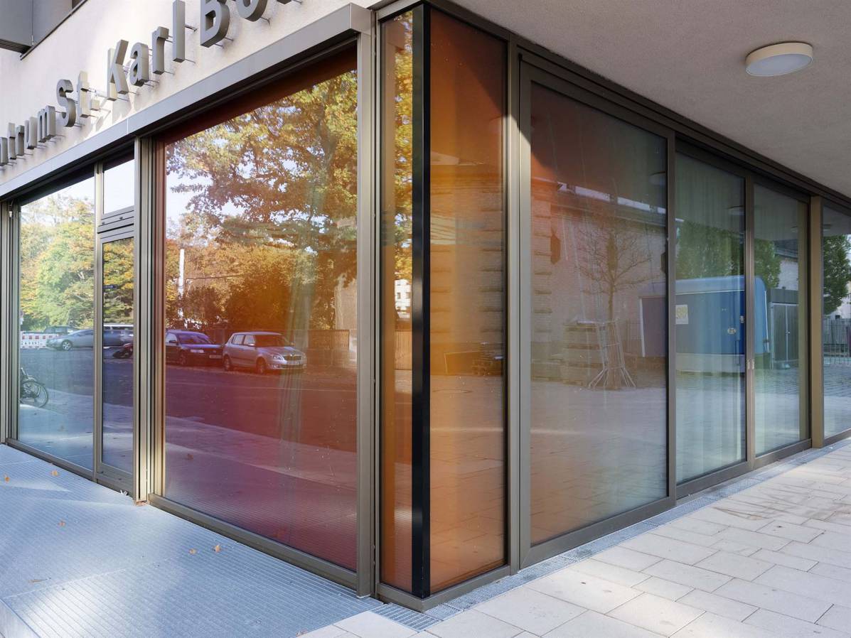 Gleich neben der Kirche St. Karl Borromäus entstand 2021 ein neues Pfarrzentrum mit Wohnungen im zweiten und dritten Obergeschoss. Der Pfarrsaal im Erdgeschoss ist an drei Seiten vollflächig verglast. Diese Transparenz und Durchsichtigkeit sollte auf Wunsch der Gemeinde und des Architekten mit einer christlichen Botschaft versehen werden, damit die Lebendigkeit der Gemeinde auch außerhalb von Veranstaltungen sichtbar wird.
