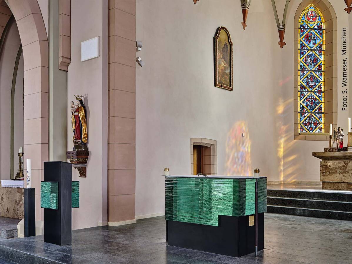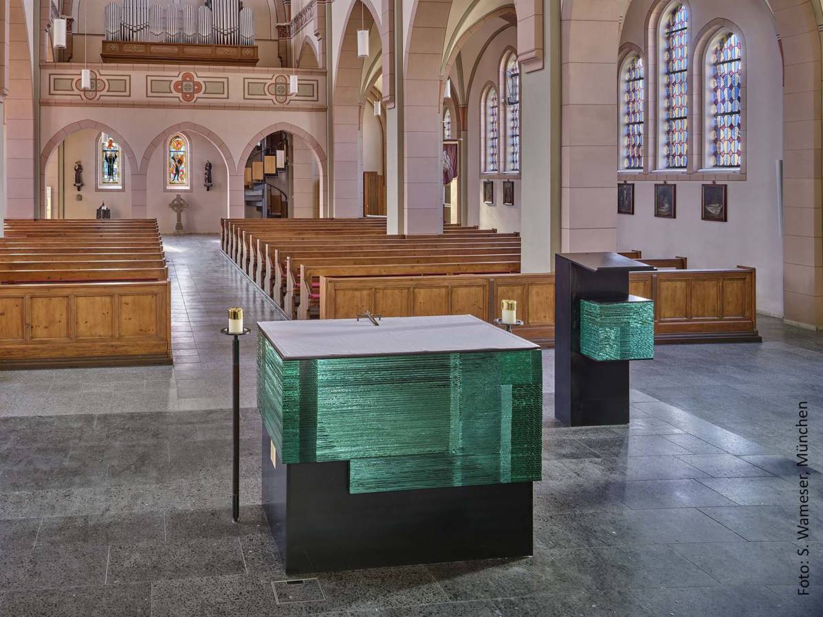 Die Kirche St. Georg ist geprägt von farbigen Glasfenstern im Chor und Langhaus. Die Künstlerin Sabine Straub greift dieses Thema auf und gestaltet Altar und Ambo aus gläsernen Blöcken, die Licht bündeln, streuen und in Spektralfarben auflösen.