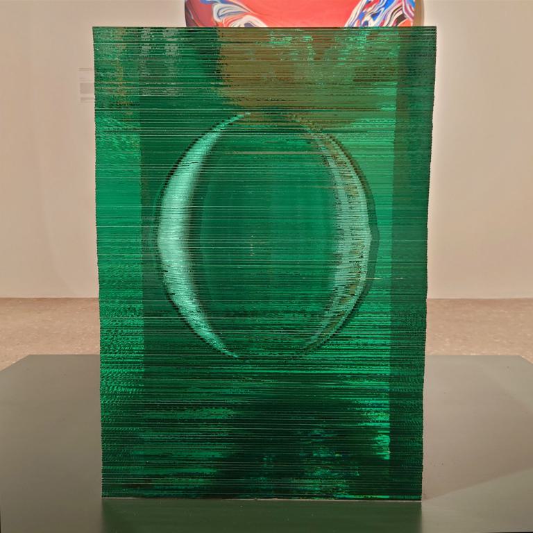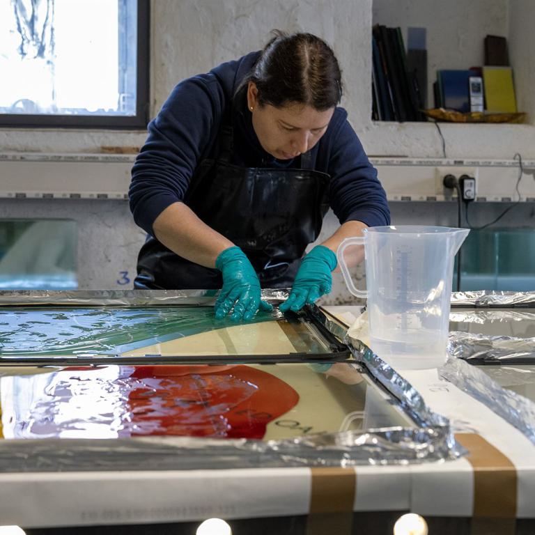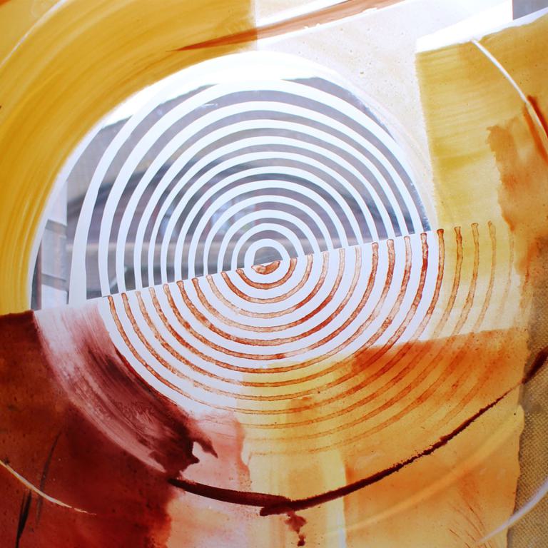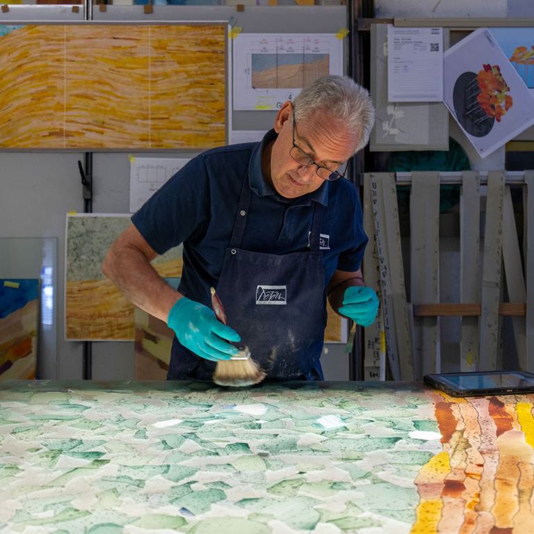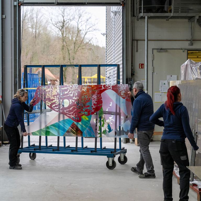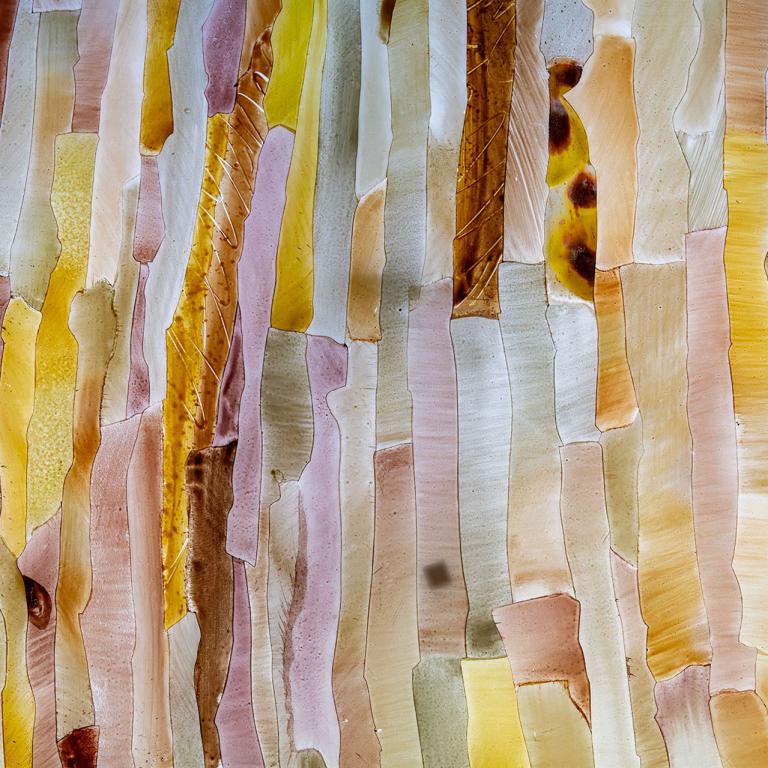Mehrschichtige händische Malerei mit keramischen Schmelzfarben auf Floatglas, Sandstrahlung, thermische Verformung nach manuell hergestellten Matritzen als Relief ausgebildet.