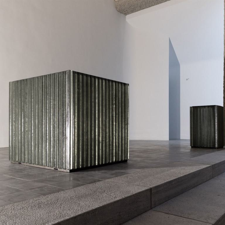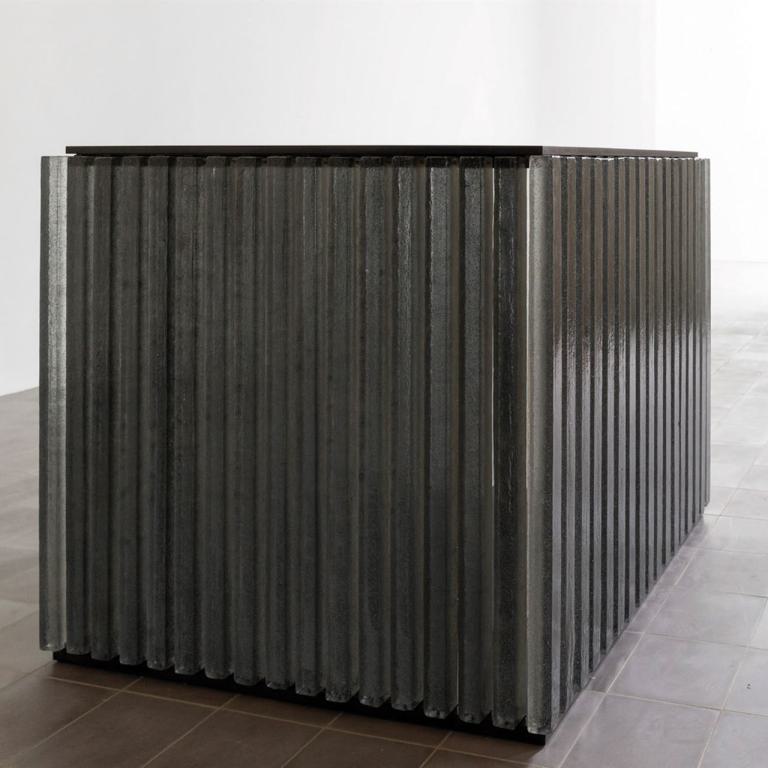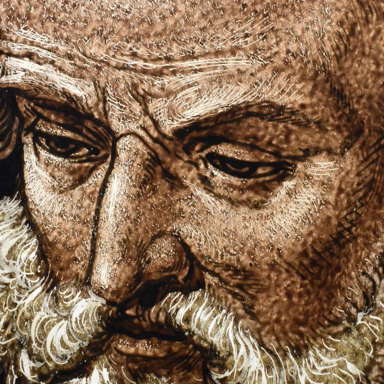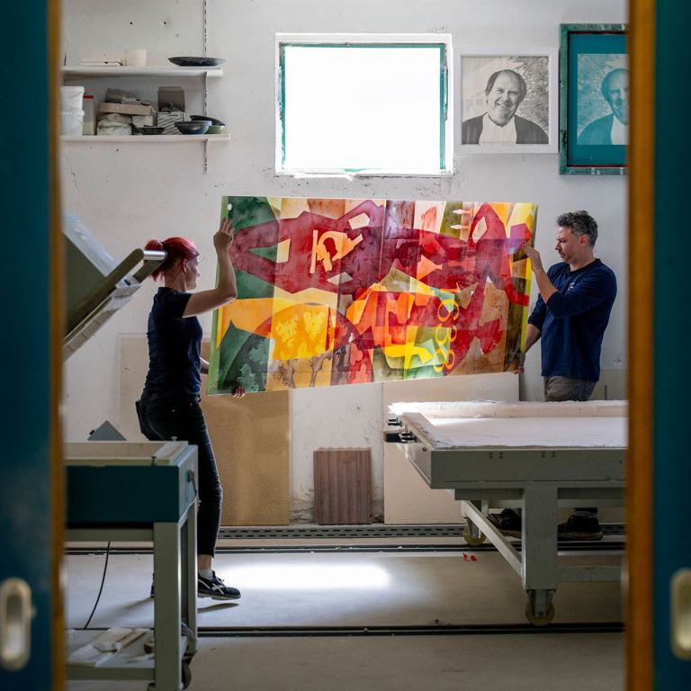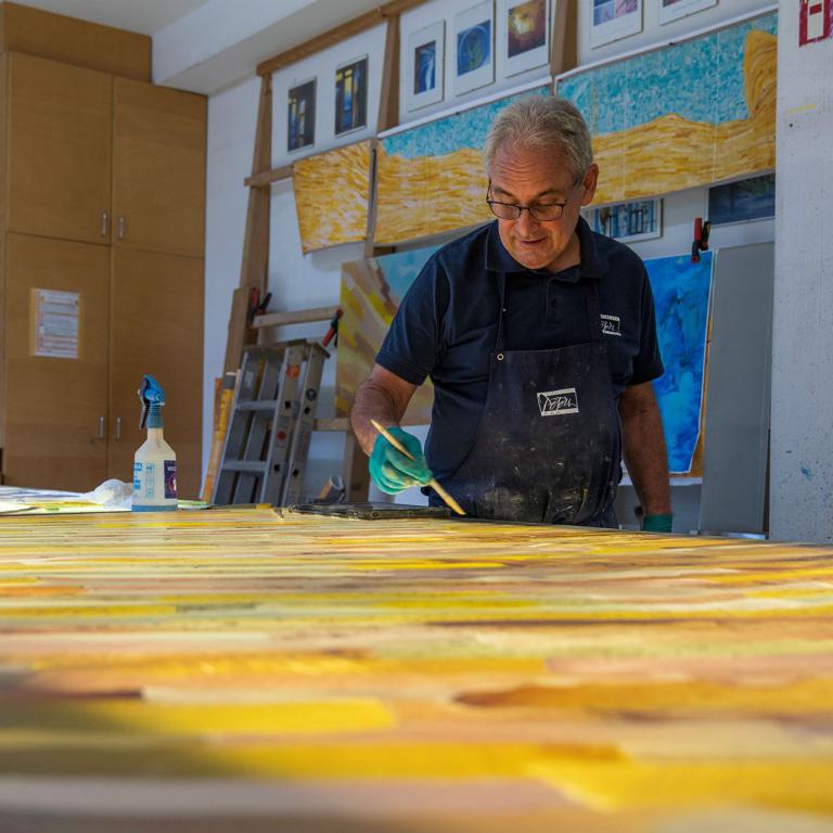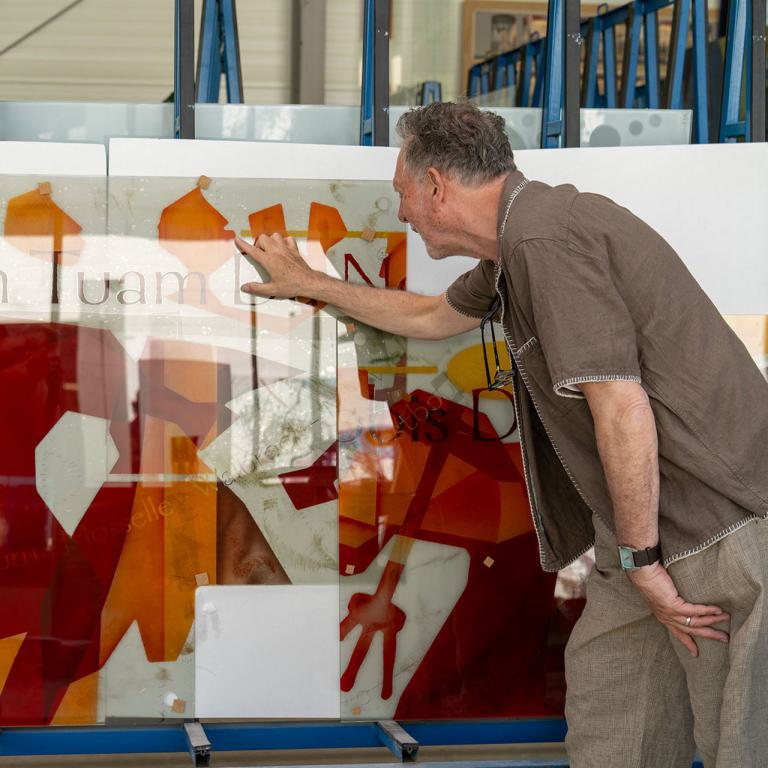 Mehrschichtige händische Malerei mit keramischen Schmelzfarben auf Floatglas, Sandstrahlung, thermische Verformung nach manuell hergestellten Matritzen als Relief ausgebildet.