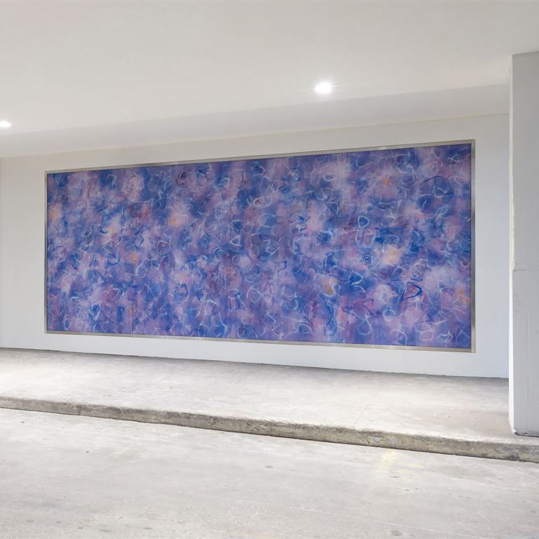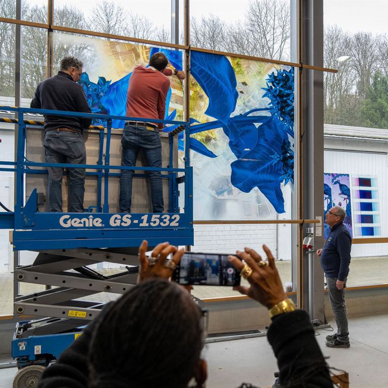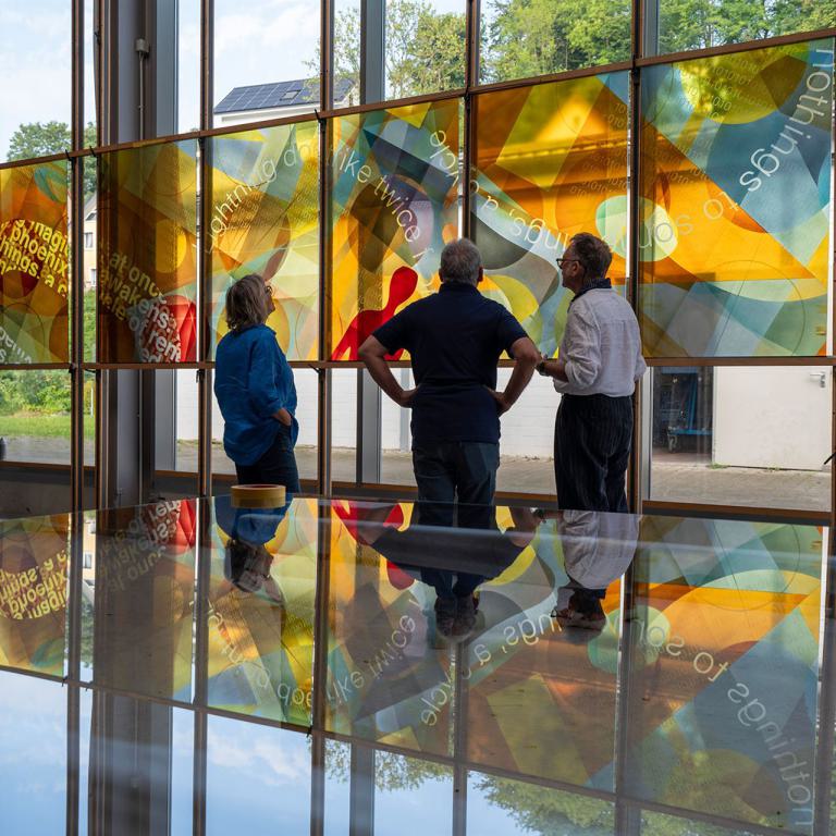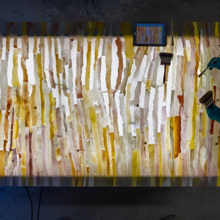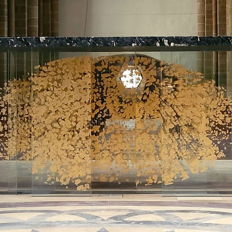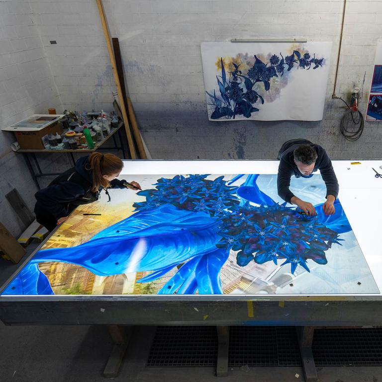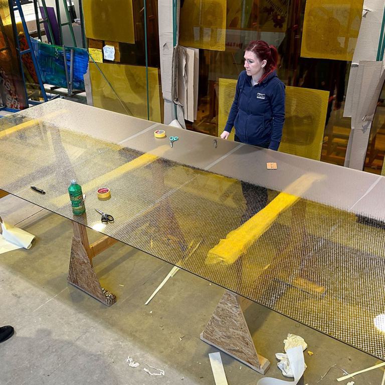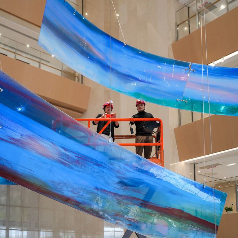“Whispers at Dusk” erstreckt sich über acht nicht reflektierende Glastafeln, die aus mehreren Schichten digitaler UV-Drucke in Kombination mit handgefertigten Glasätzungen bestehen, um die Pinselstriche und Texturen des Originalgemäldes wiederzugeben.