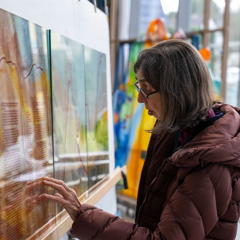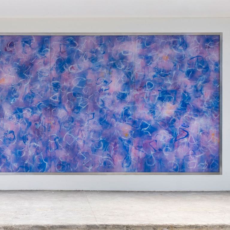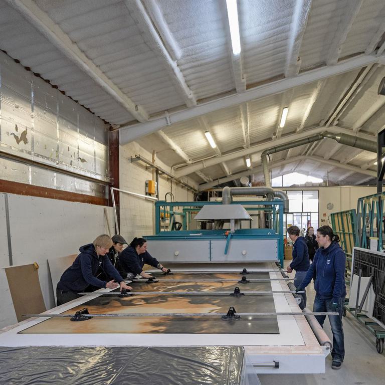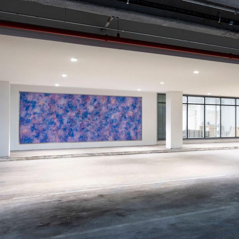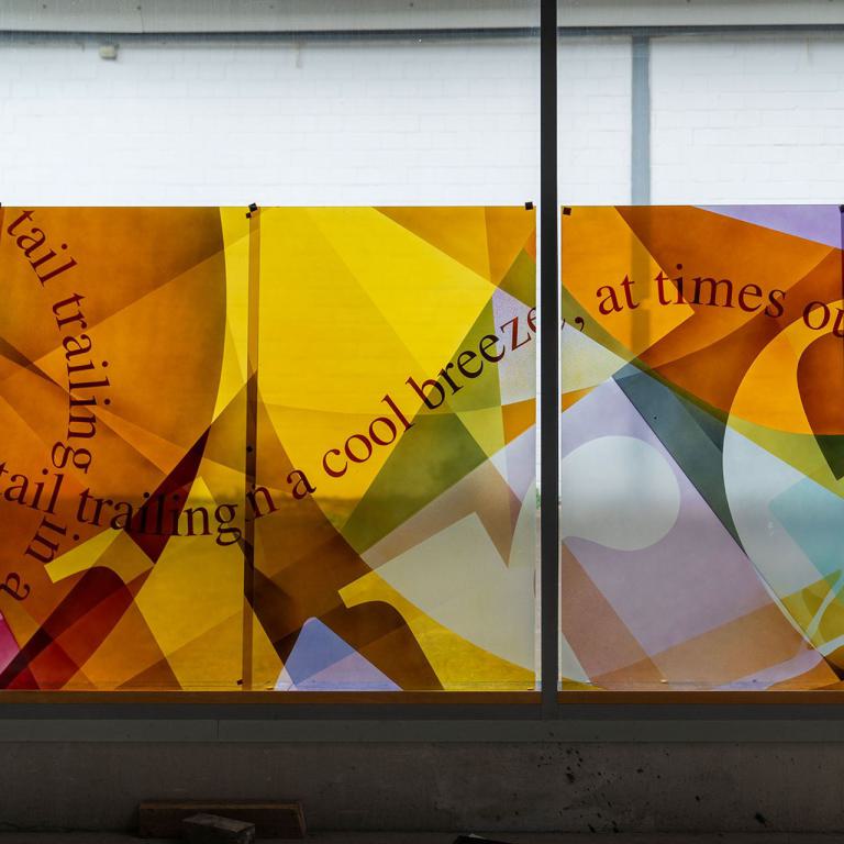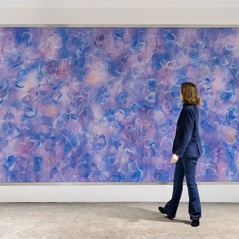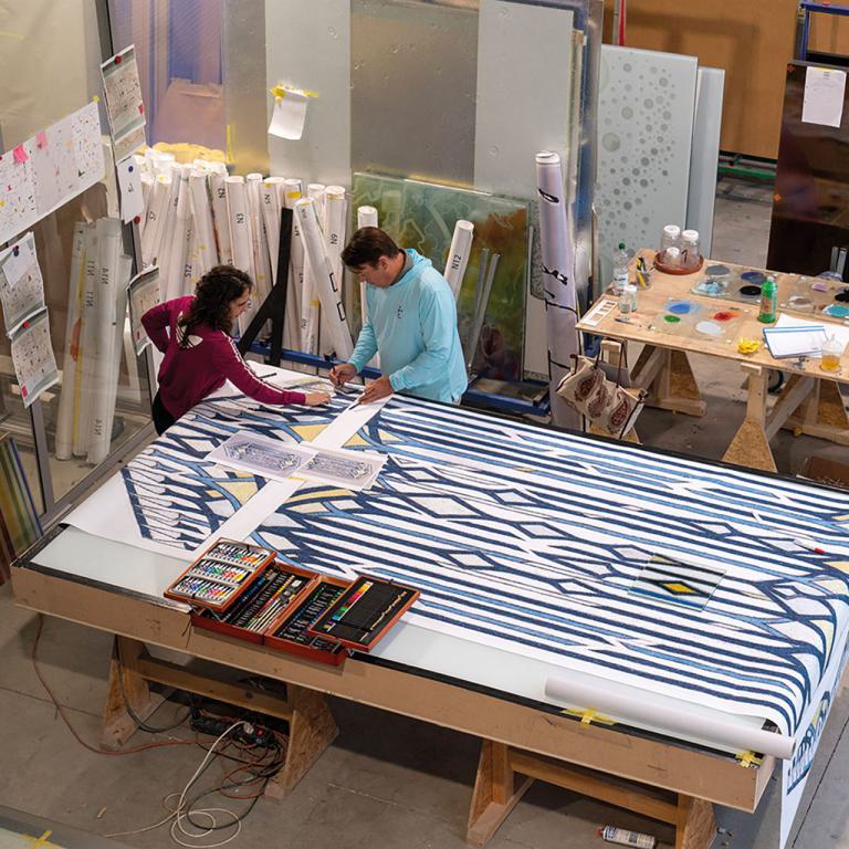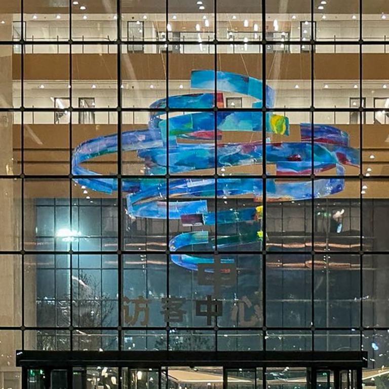 “Whispers at Dusk” erstreckt sich über acht nicht reflektierende Glastafeln, die aus mehreren Schichten digitaler UV-Drucke in Kombination mit handgefertigten Glasätzungen bestehen, um die Pinselstriche und Texturen des Originalgemäldes wiederzugeben.