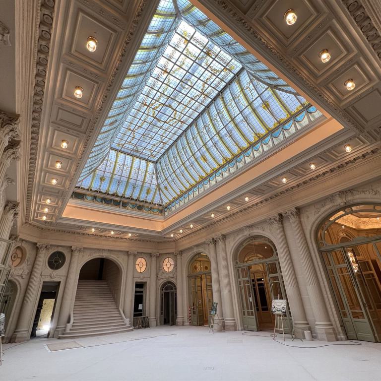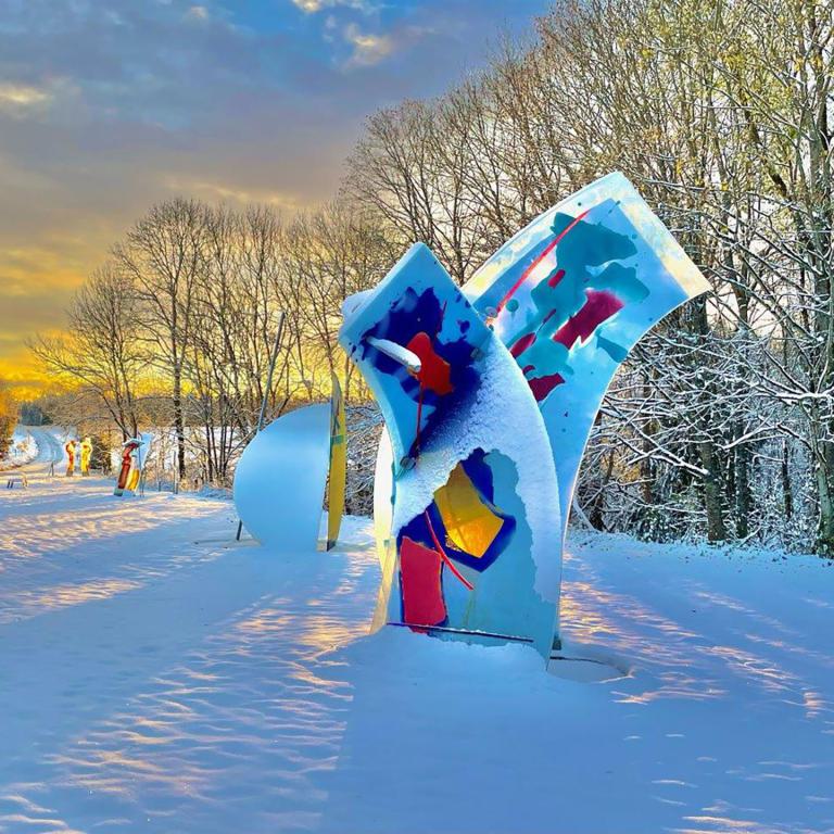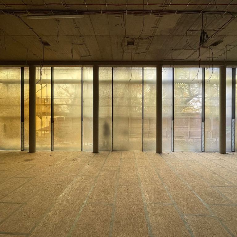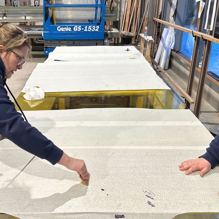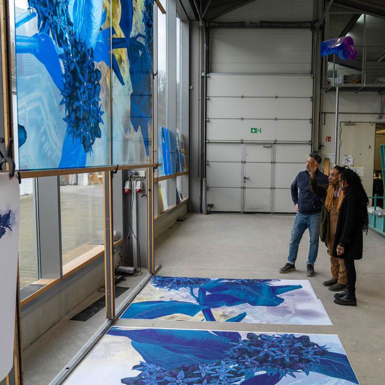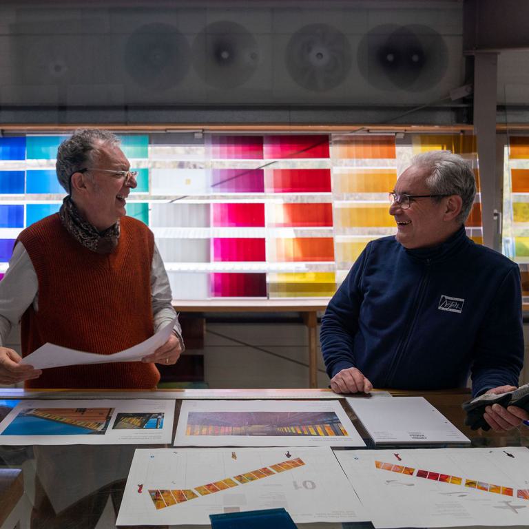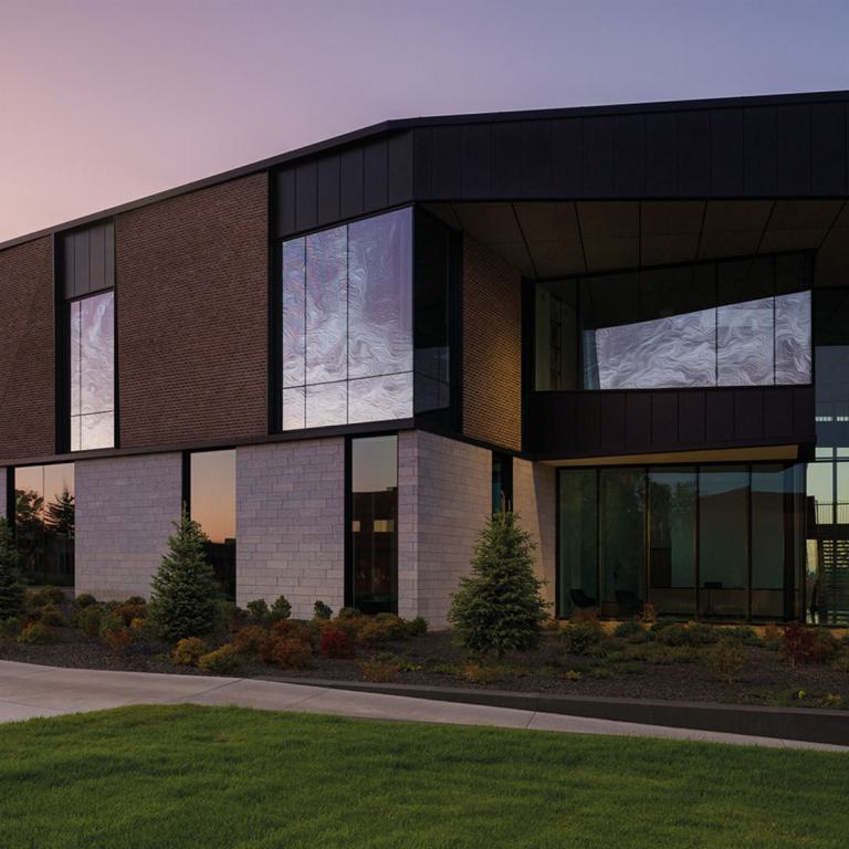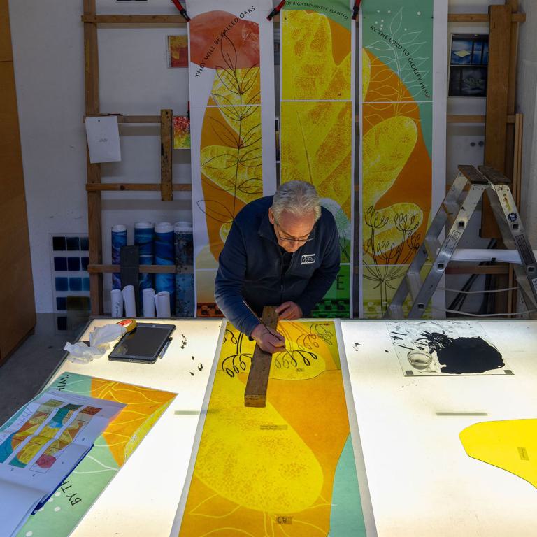 “Whispers at Dusk” erstreckt sich über acht nicht reflektierende Glastafeln, die aus mehreren Schichten digitaler UV-Drucke in Kombination mit handgefertigten Glasätzungen bestehen, um die Pinselstriche und Texturen des Originalgemäldes wiederzugeben.