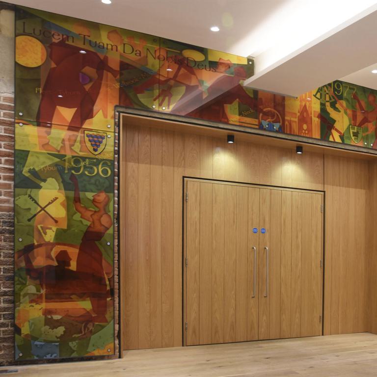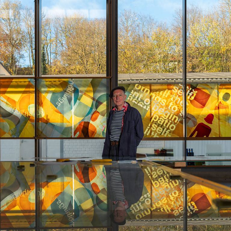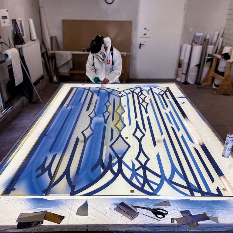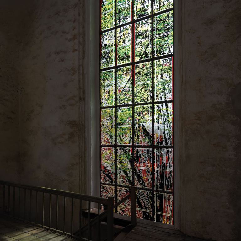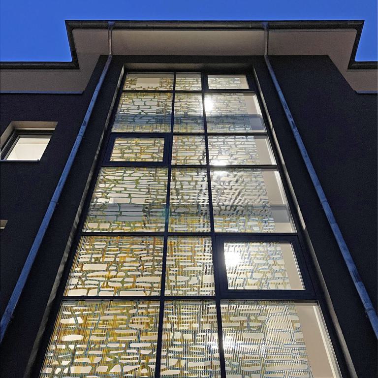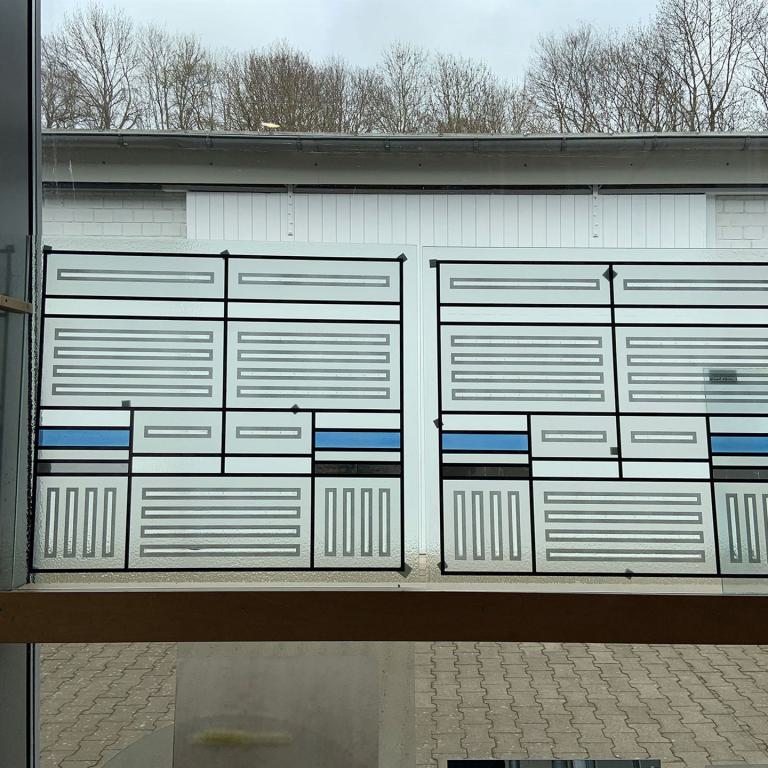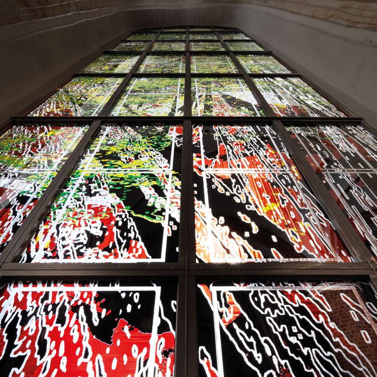 Großformatige Glasmalerei mit Silberbeize in Kombination mit Chrombeschichtigung, sowie innenliegender Malerei mit Mattweiß.