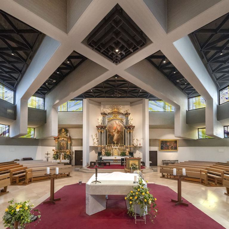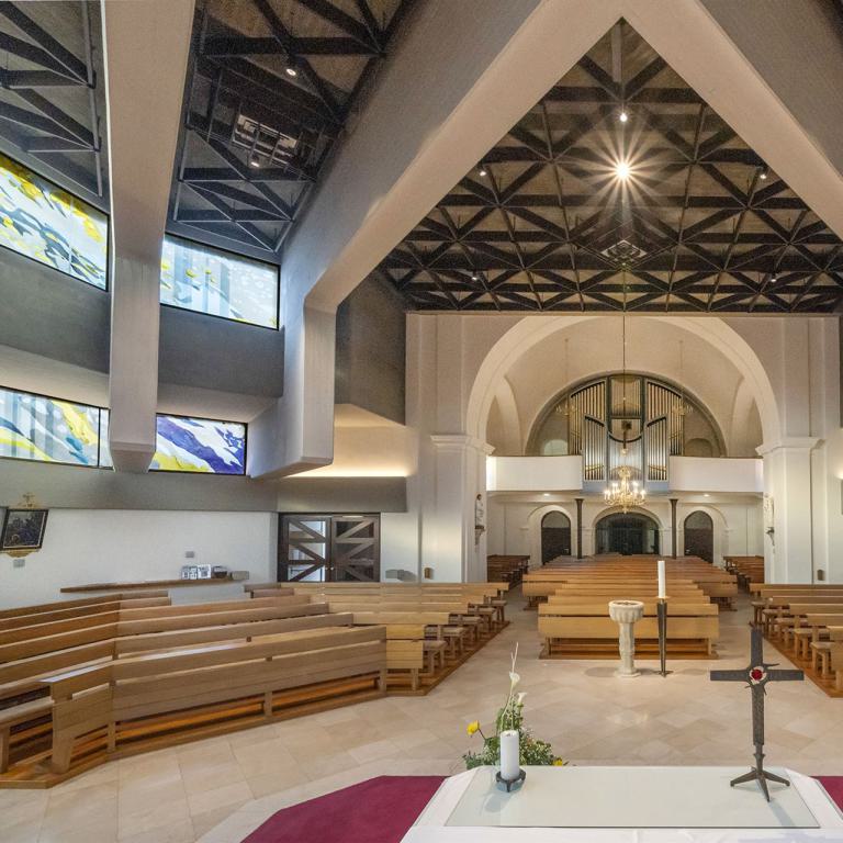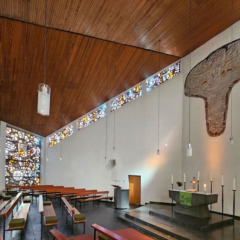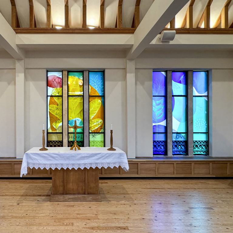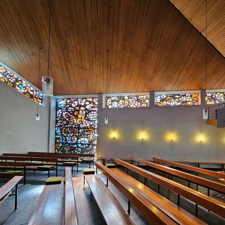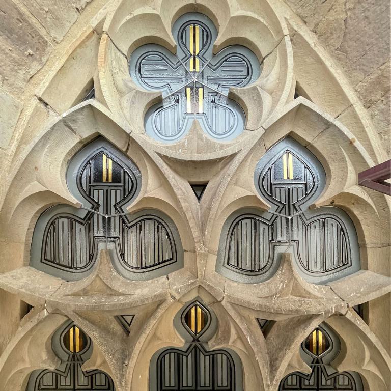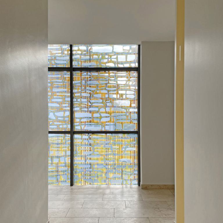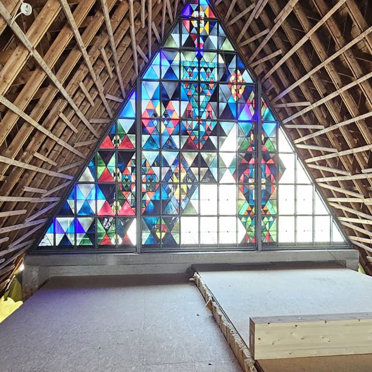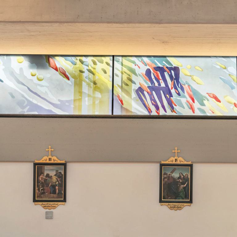 Transluzente Fenster, die je nach Sonnenstand ein wechselndes Lichtspiel erzeugen. Die Fenster zeigen den Sternenhimmel zur Geburtsstunde Christi.