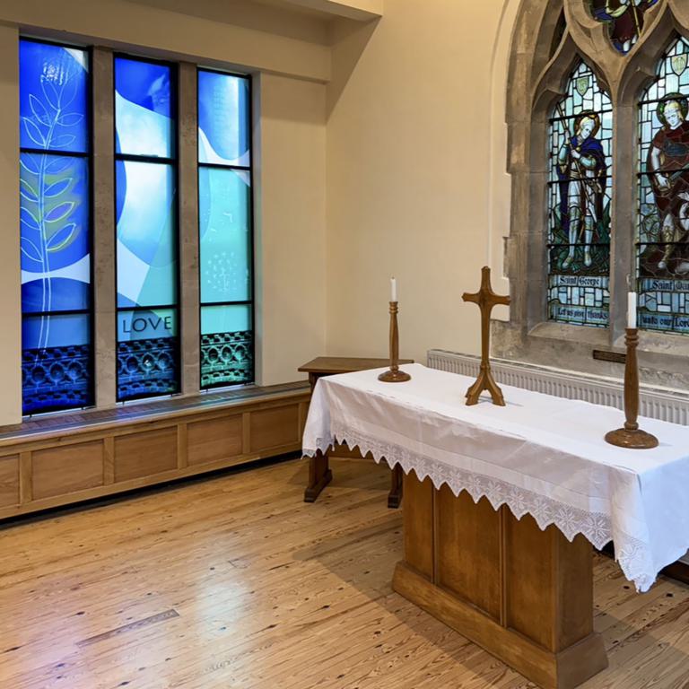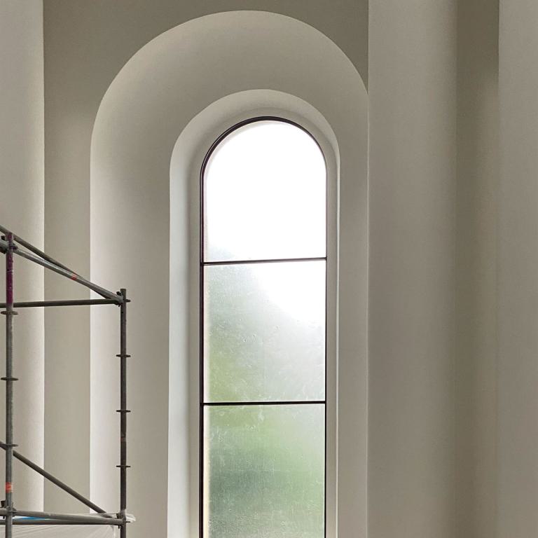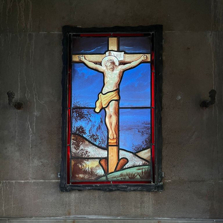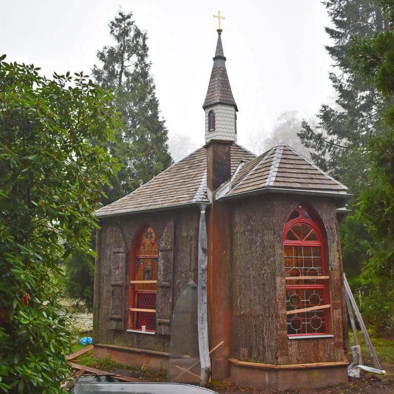 Es handelt sich um eine kleine Inselkapelle in einem Englischen Garten, der im 19. Jahrhundert angelegt wurde. Die Verglasung besteht aus verschiedenen historischen Fragmenten, darunter barocke Wappenscheiben, von denen eine auf den Fotos zu sehen ist. Die Fenster wurden nicht vollständig schutzverglast, sondern nur die Fragmente in Messing gerahmt, vor die Fensterebene gesetzt und an ihrer Stelle ein Schutzglas eingebleit (partielle Schutzverglasung).