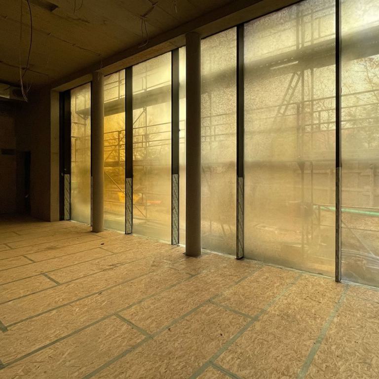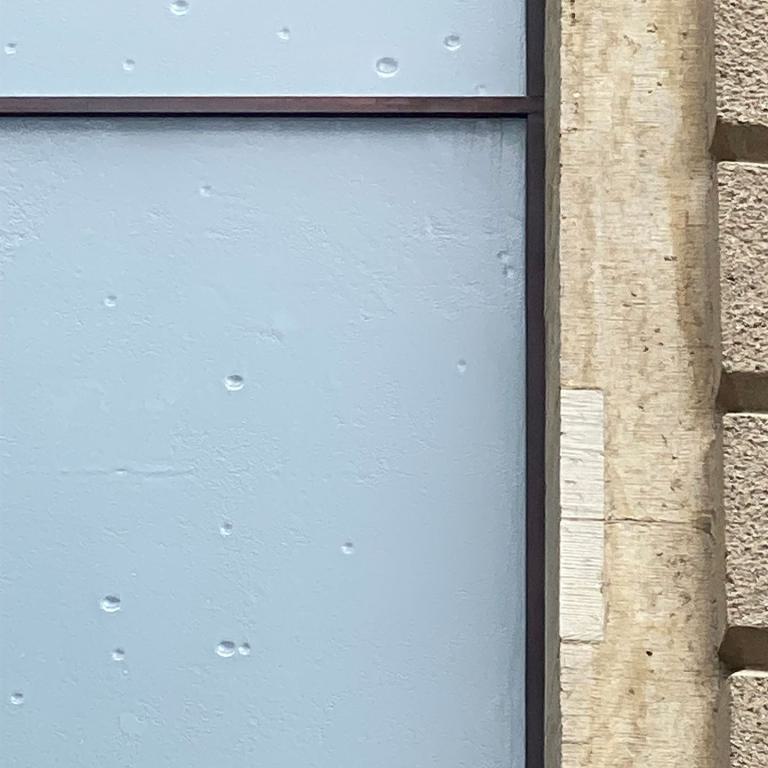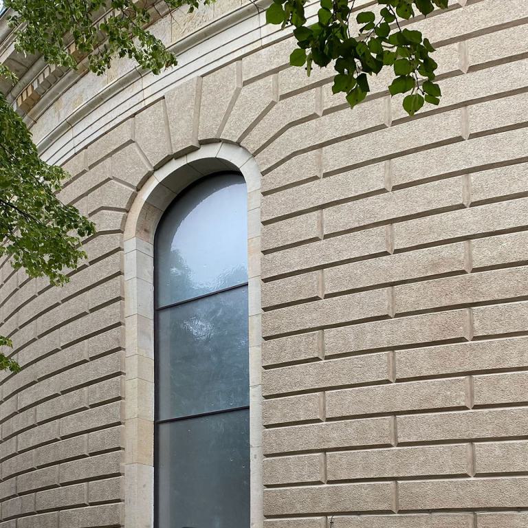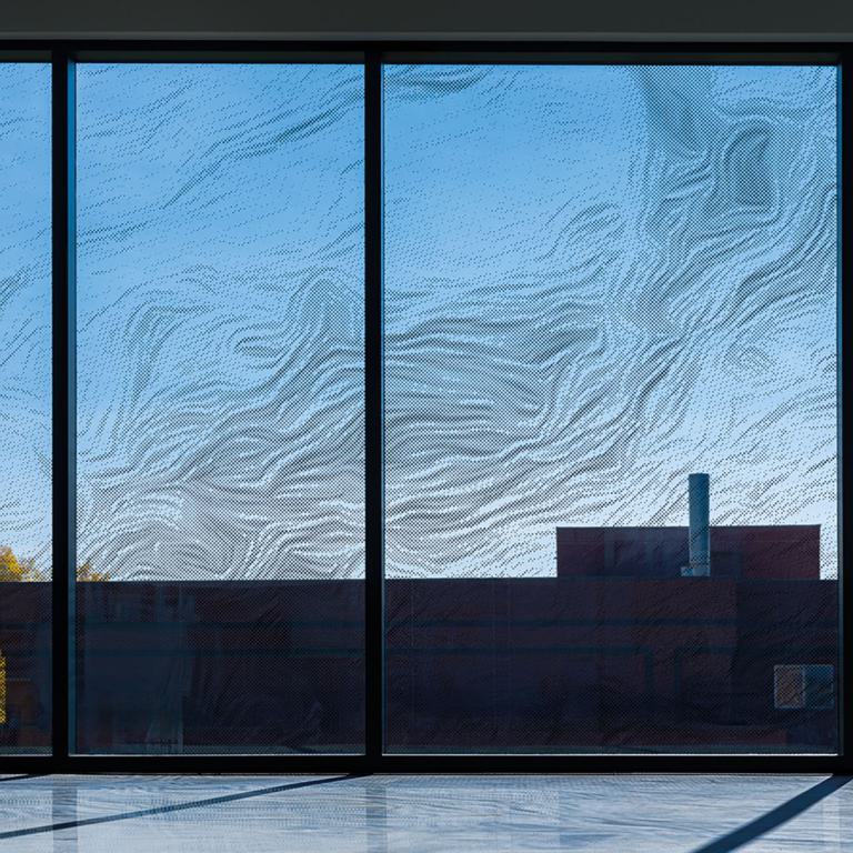 Ausführung als keramischer Digitaldruck mit keramischem "Sfumato" (Überzug) zur Weichzeichnung und Reduzierung der Spiegelung. Thermisch vorgespanntes Glas mit anschließendem Heißlagerungstest (Heat-Soak-Test).