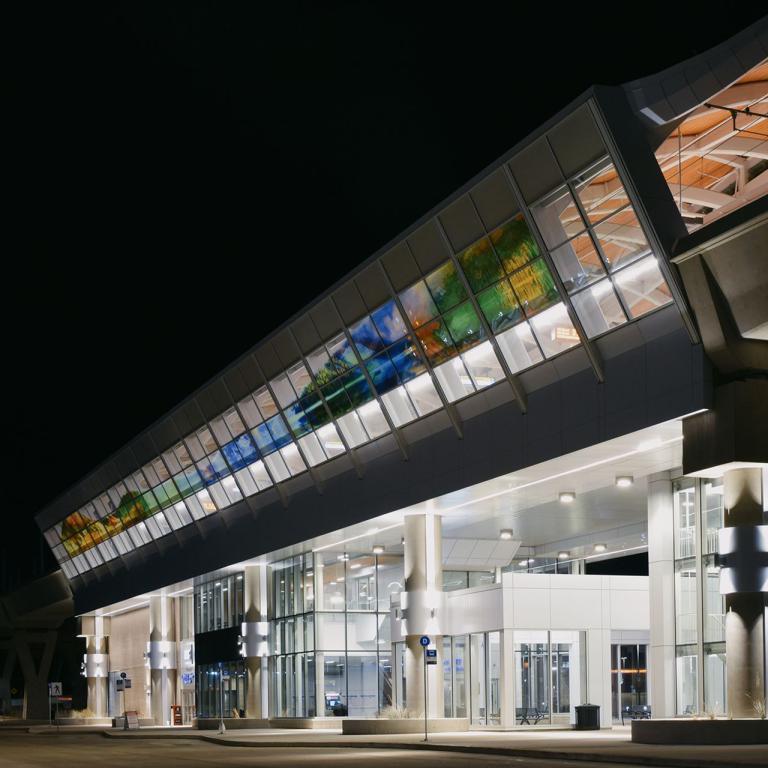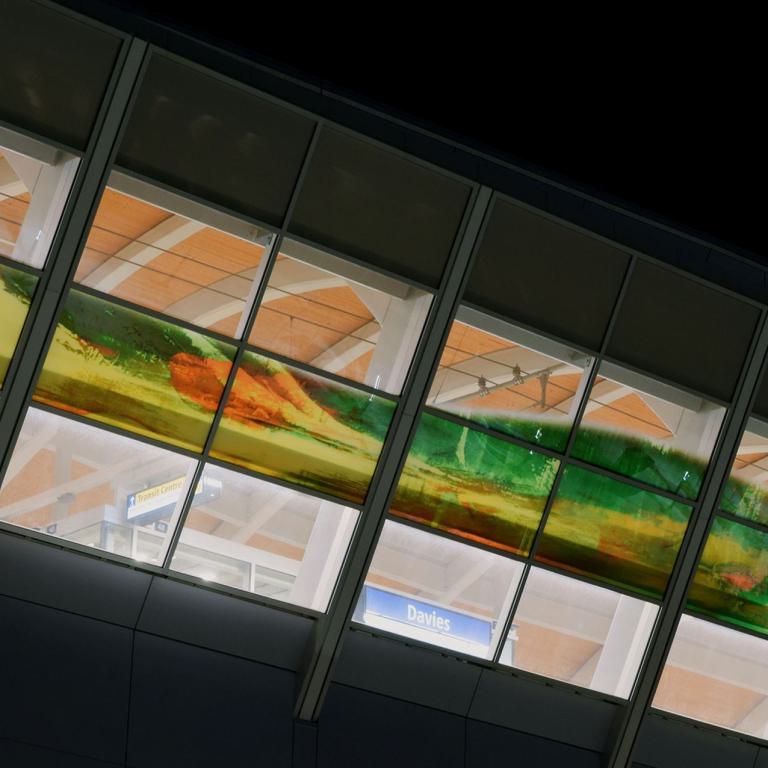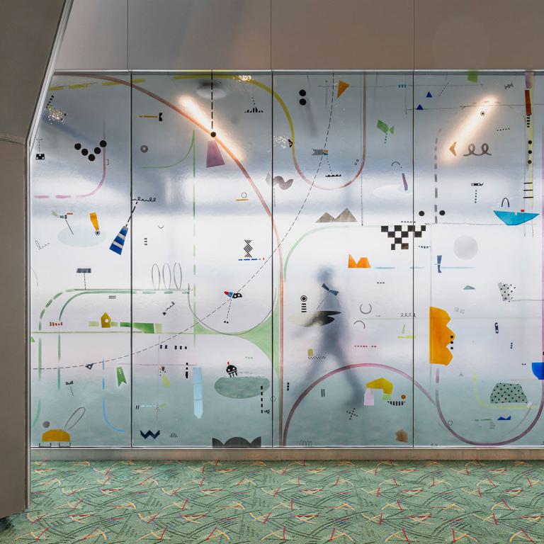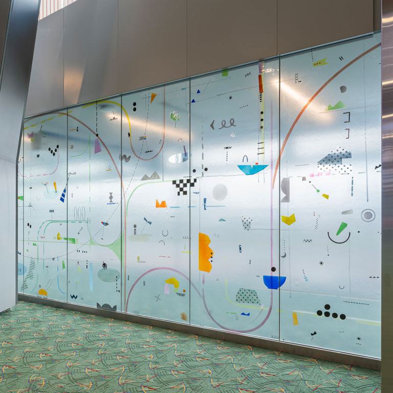 Glasinstallation "Between". Auf zwei rund 17 Meter langen Glaswänden entlang der Sicherheitskontrollen schuf die Künstlerin Yoonhee Choi eine abstrakte Komposition, die das Thema Reise und Kommunikation aufgreift und eine einladende Atmosphäre vermittelt.