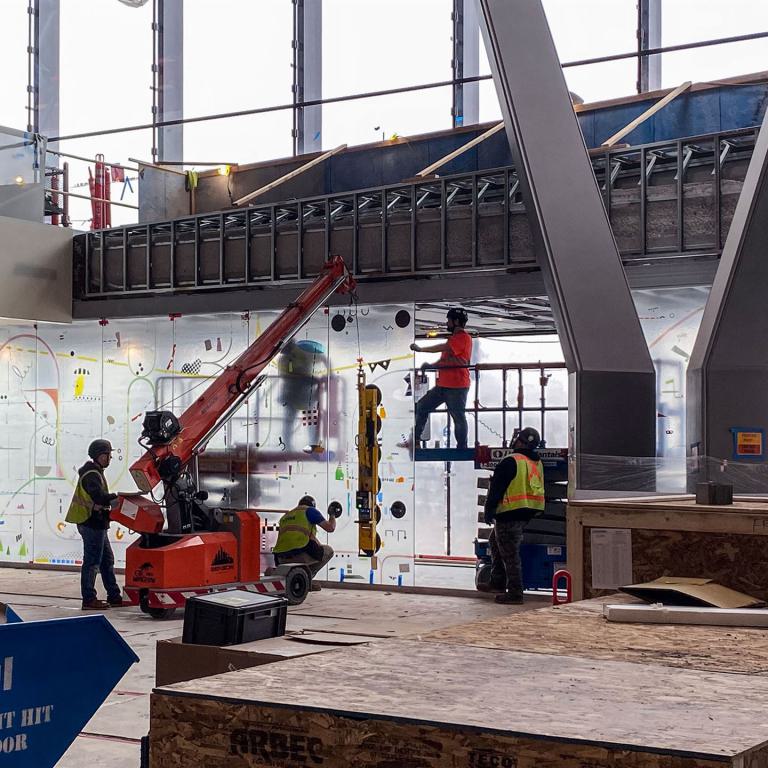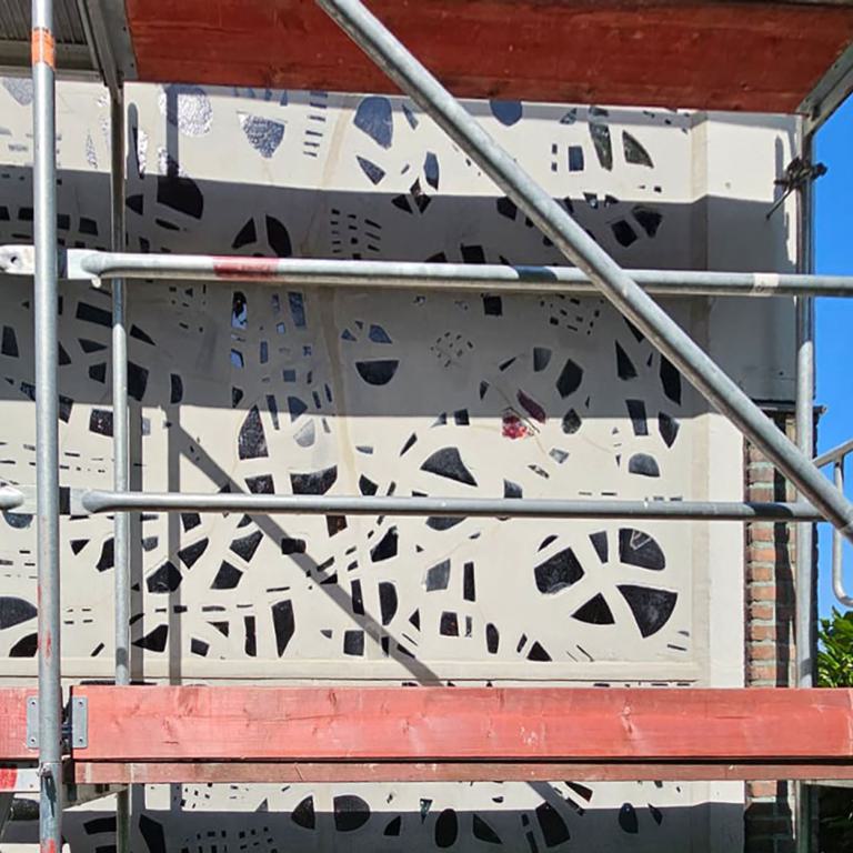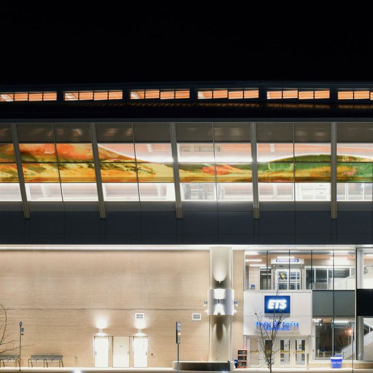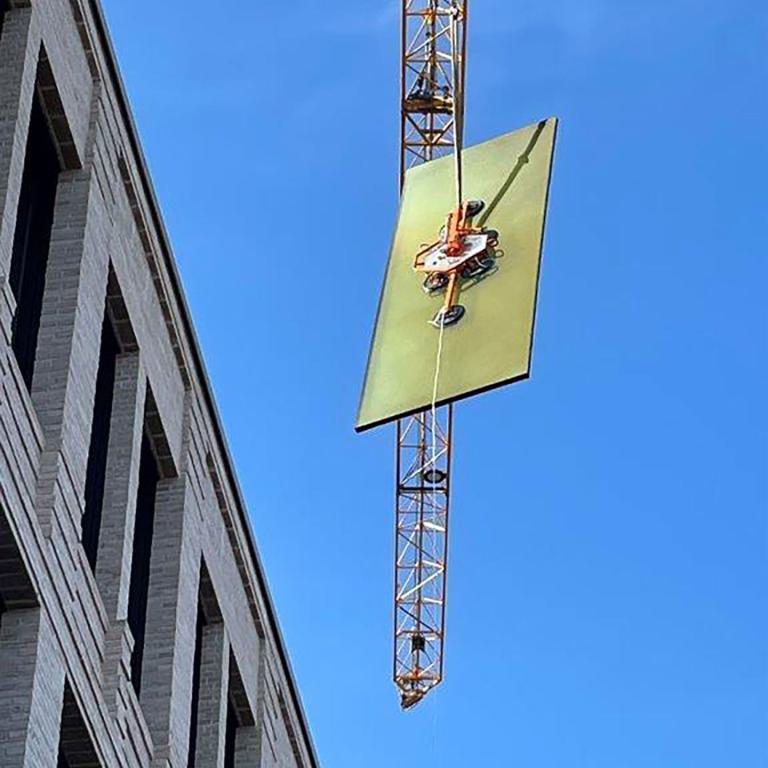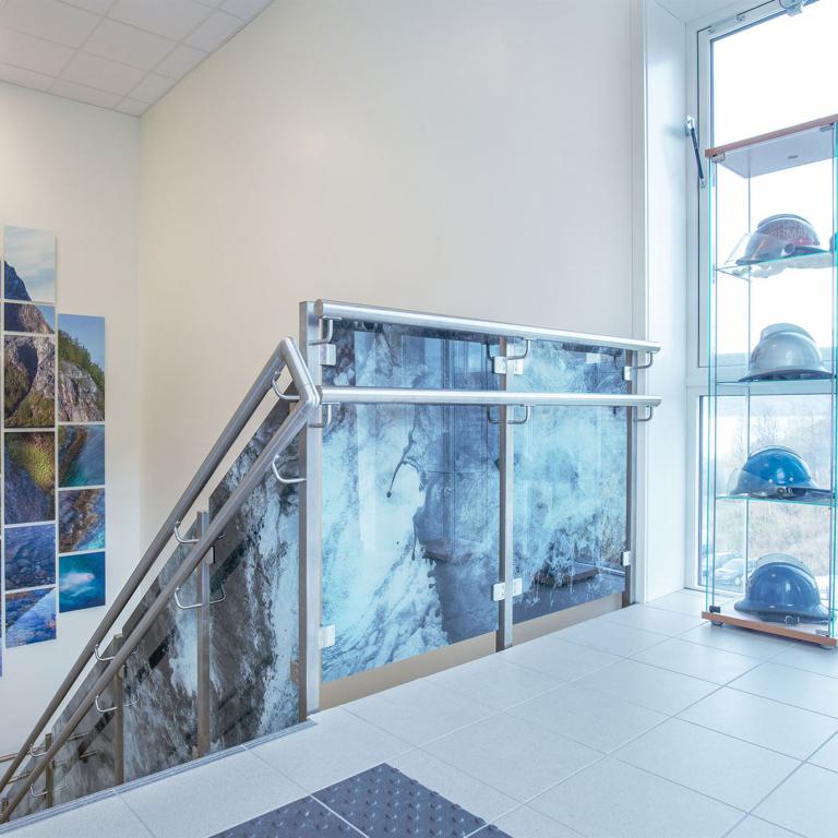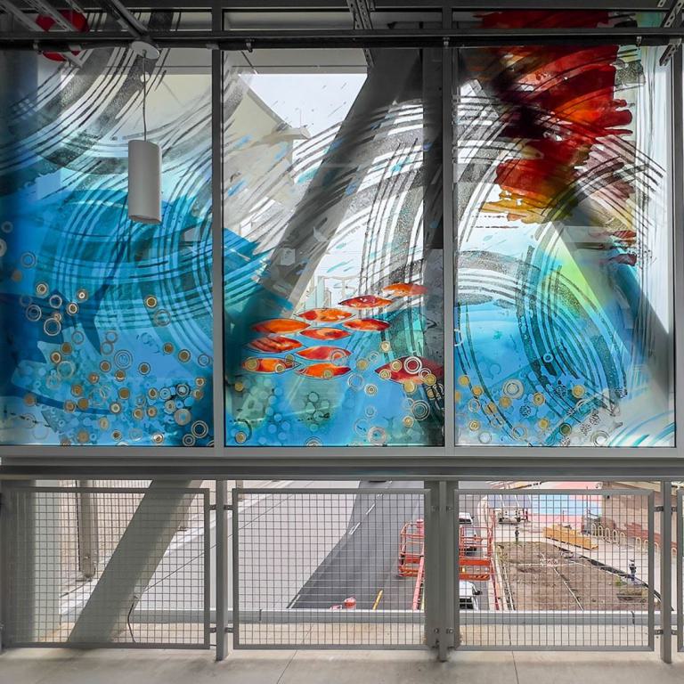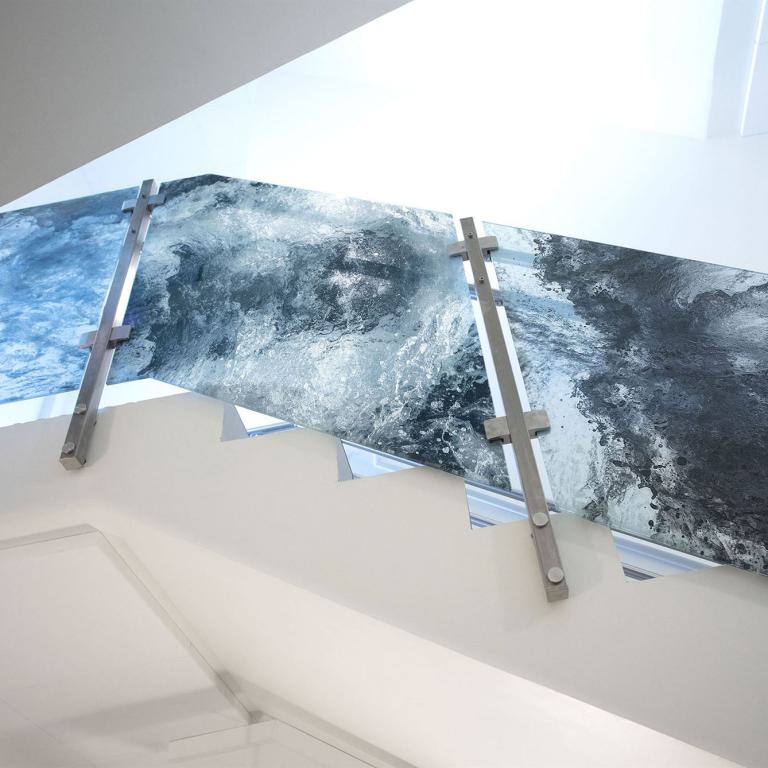 Der Entwurf des Künstlers wurde mit keramischem Digitaldruck realisiert und das Glas wurde zu Verbundsicherheitsglas verarbeitet. Das Glaskunstgeländer erstreckt sich über Stockwerke der Feuerwache.