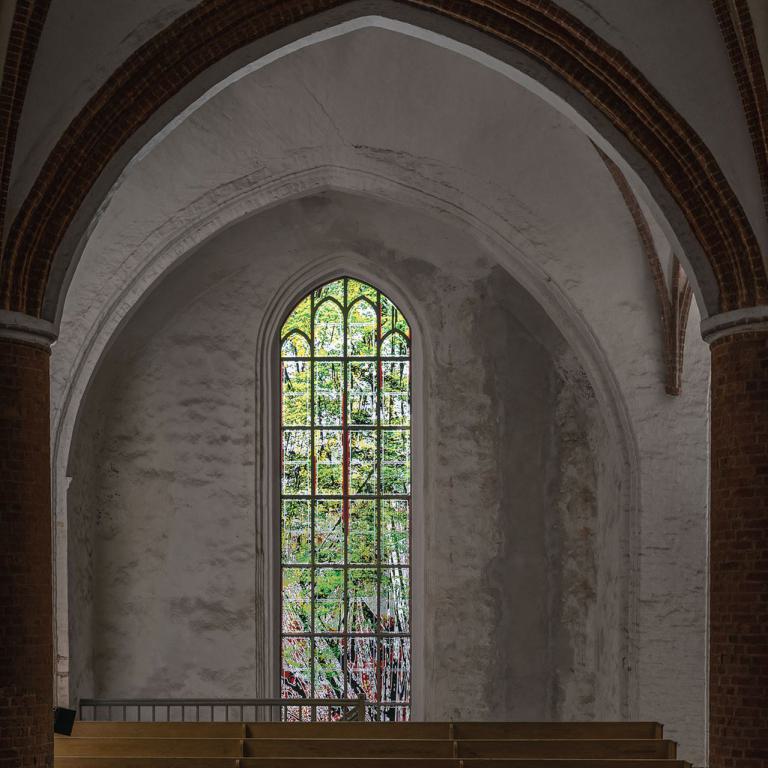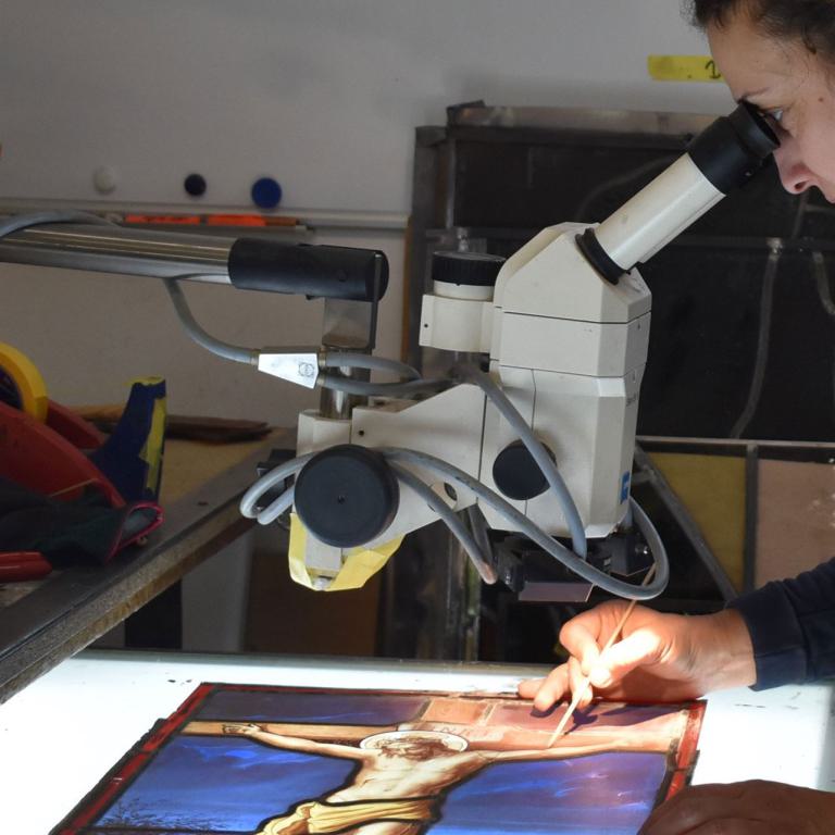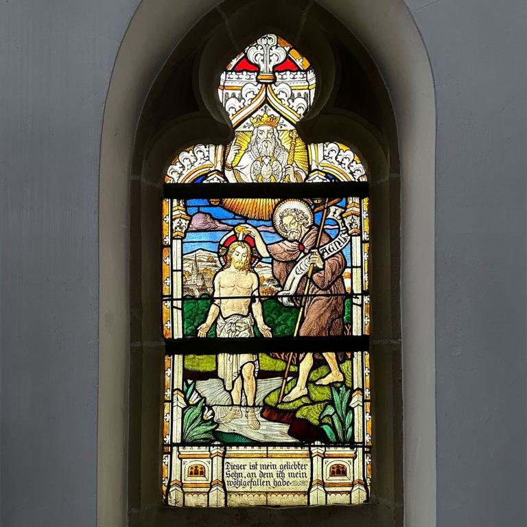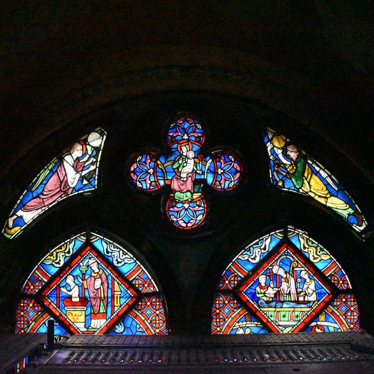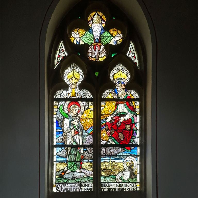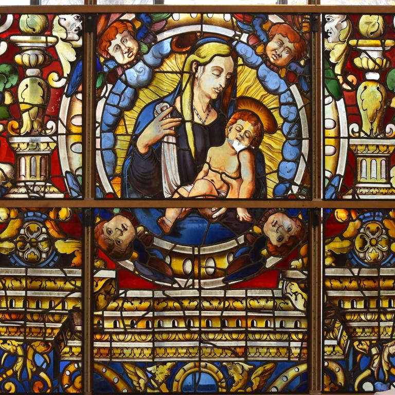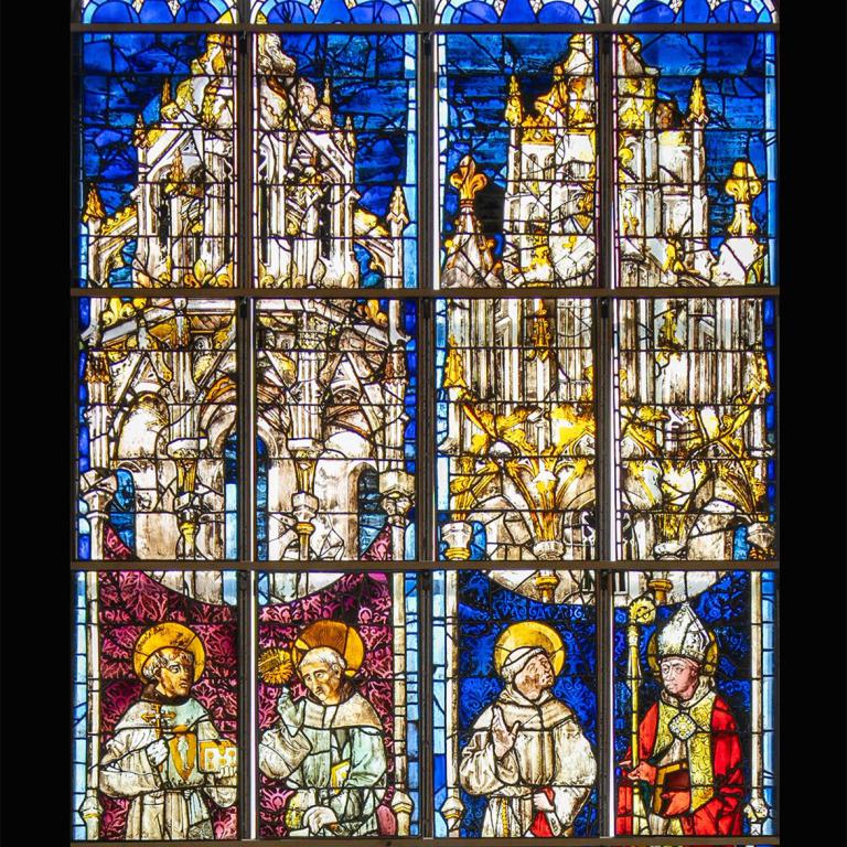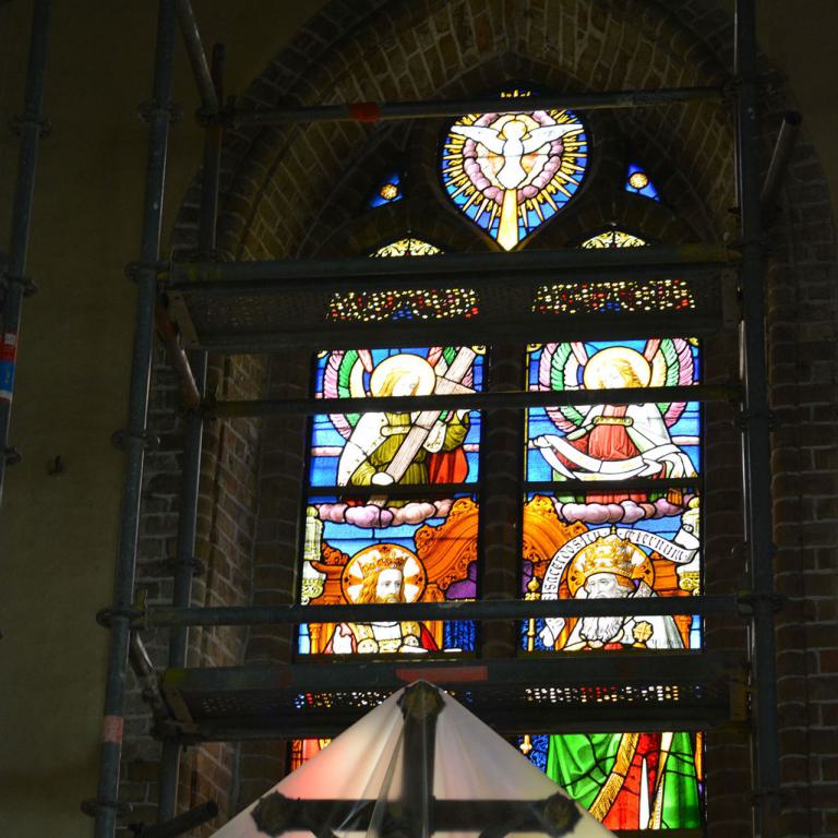 Restaurierung der Chorfenster aus dem 19. Jahrhundert. Malerische Neutralretusche der ausgewaschenen Farbpartien in primären Bildzonen auf hinterlüfteten Doublierungsscheiben.