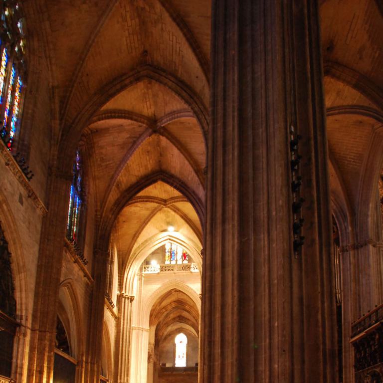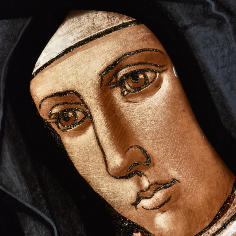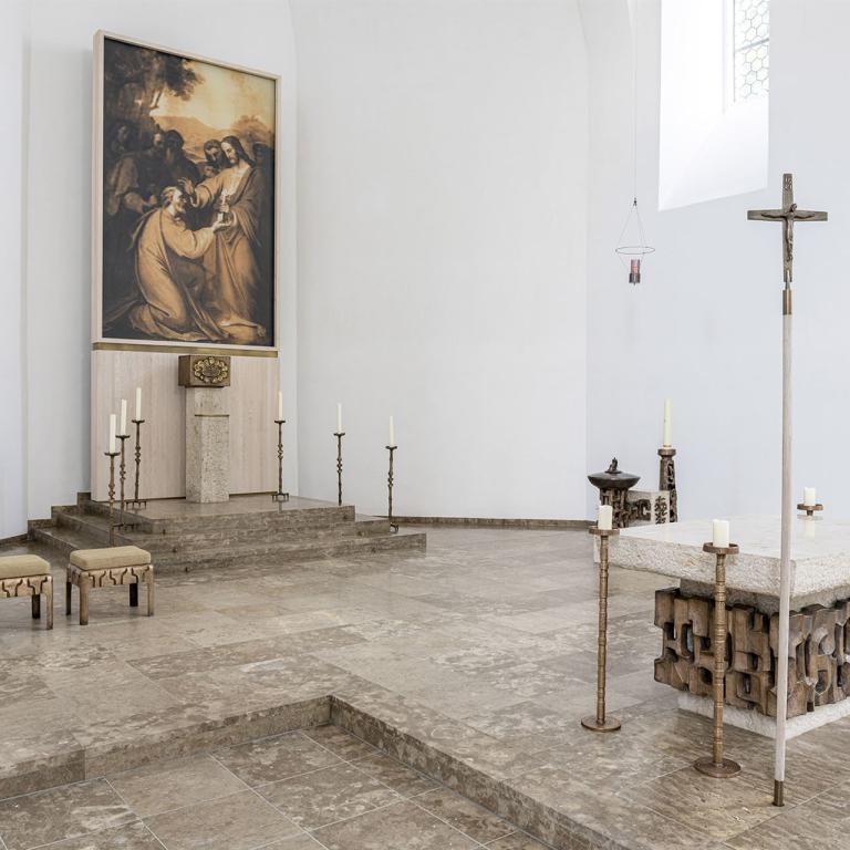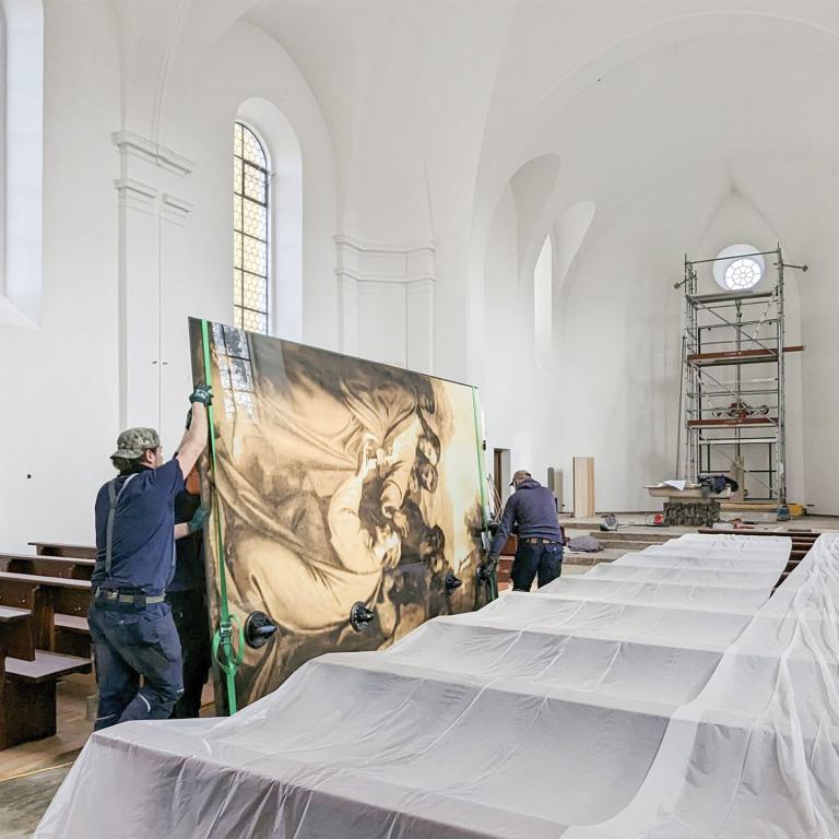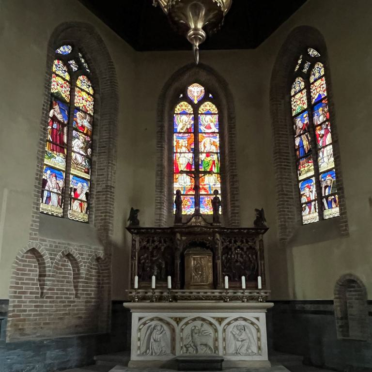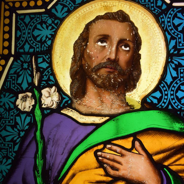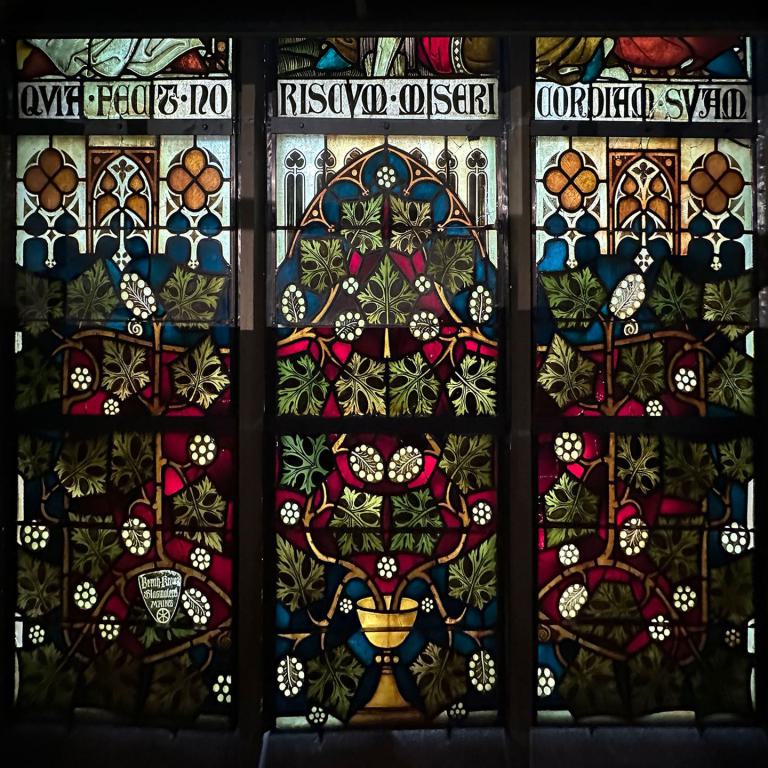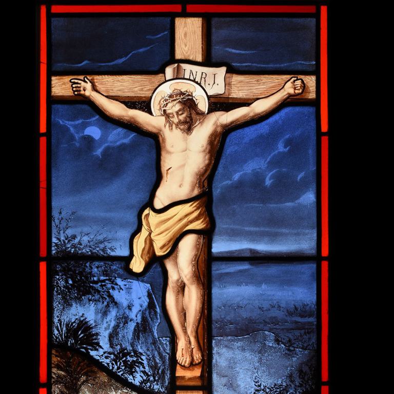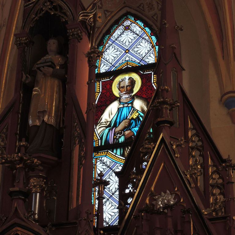 Restaurierung der Chorfenster aus dem 19. Jahrhundert. Malerische Neutralretusche der ausgewaschenen Farbpartien in primären Bildzonen auf hinterlüfteten Doublierungsscheiben.