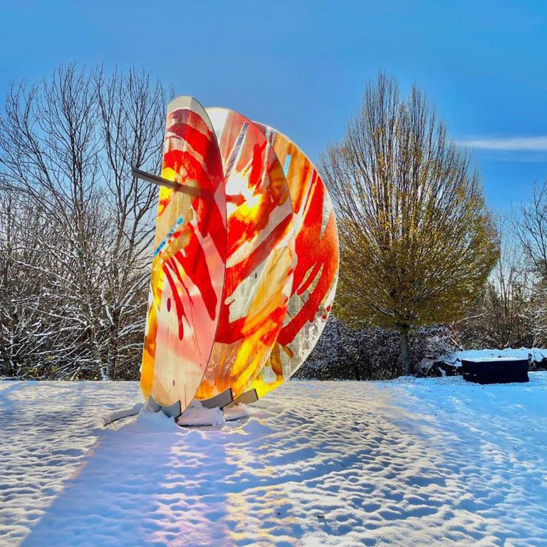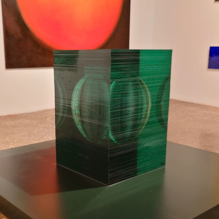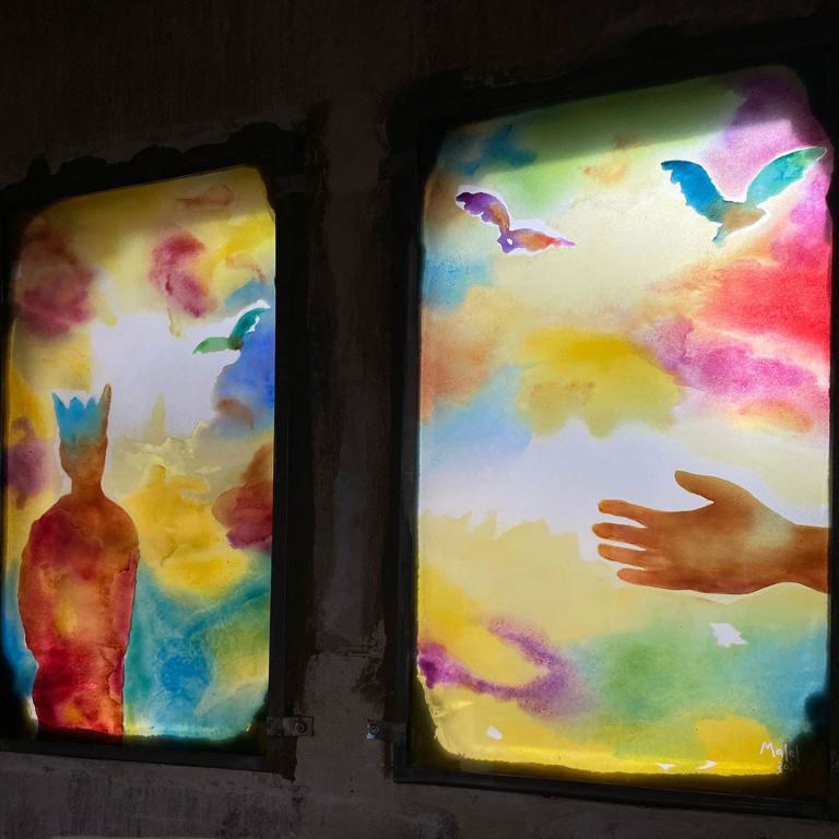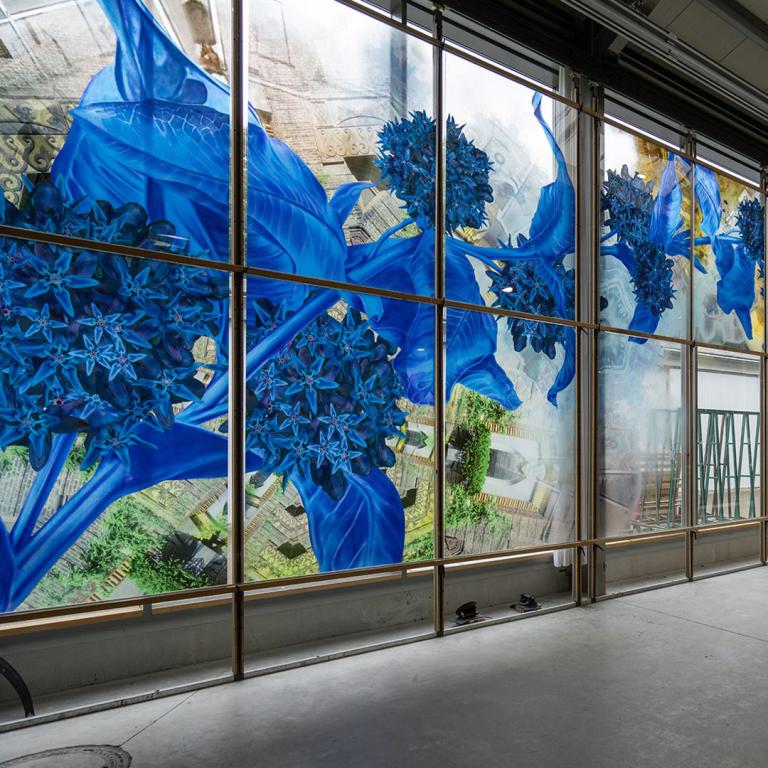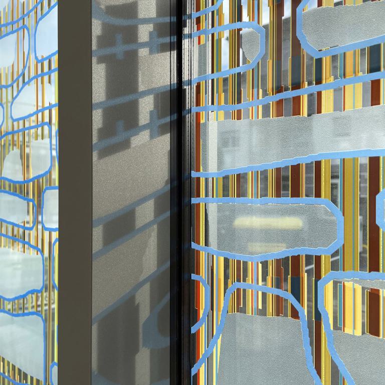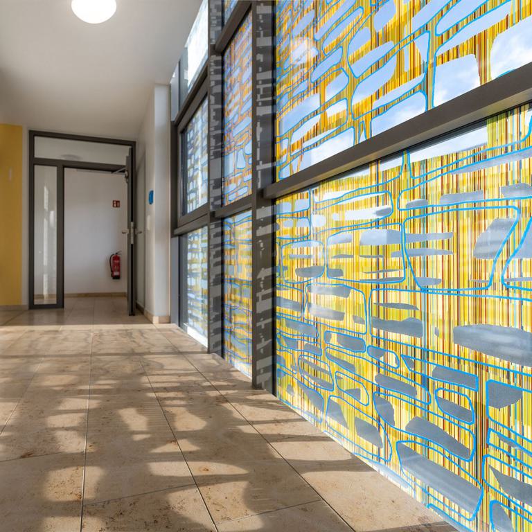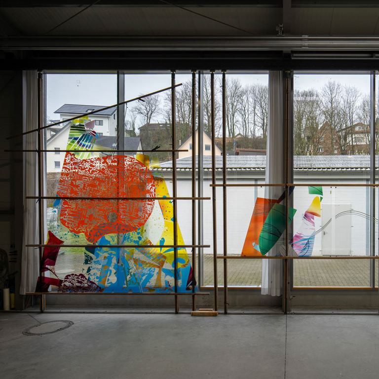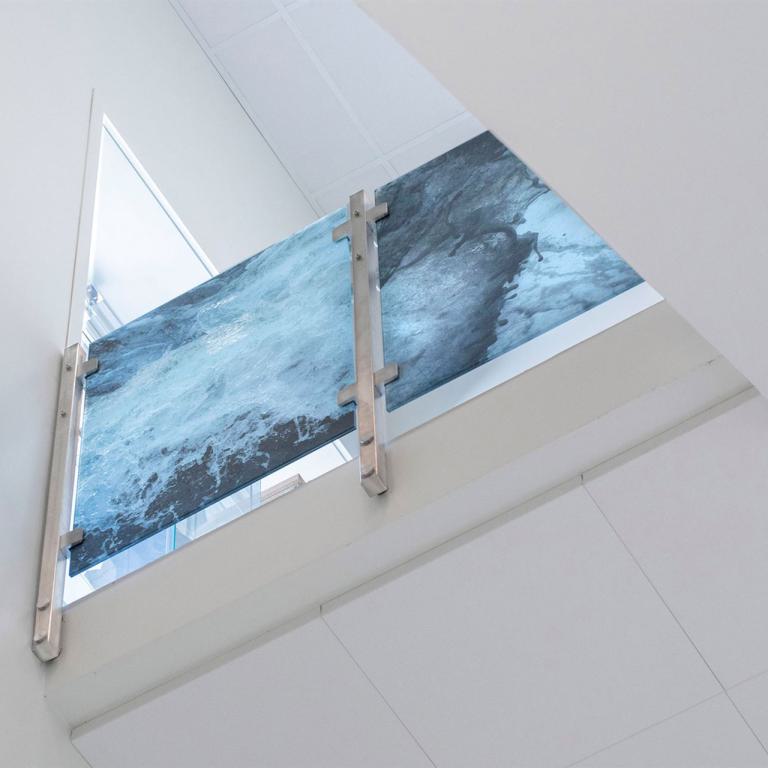 Hand- und Airbrushmalerei in mehreren Schichten auf Sicherheitsglas, Aufrechstehend auflaminierte Glaslamellen.
