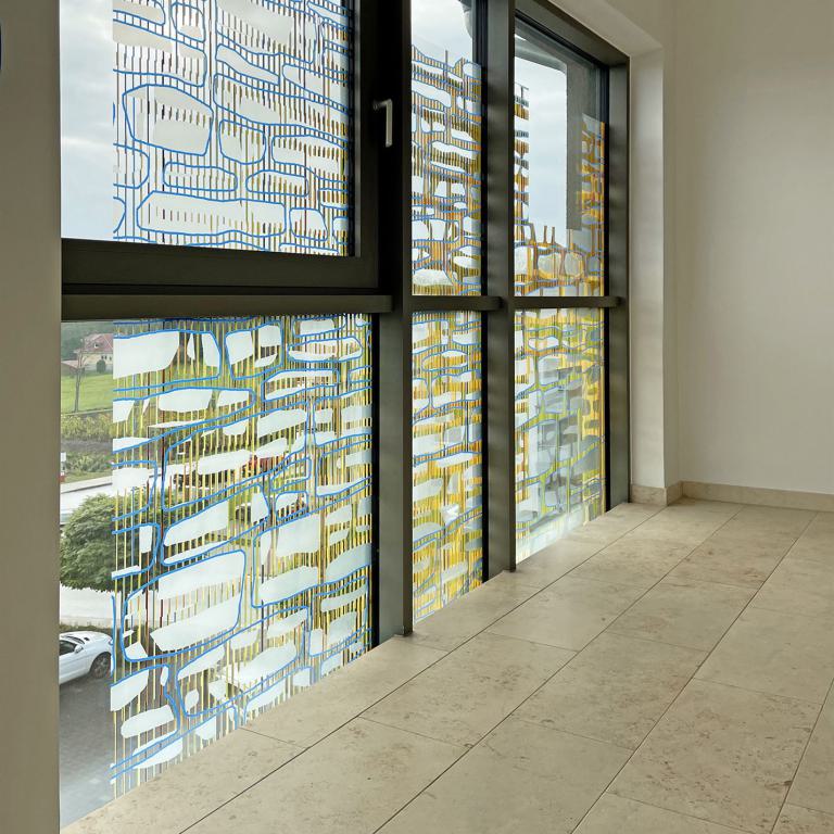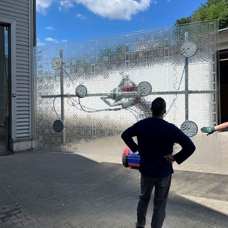 Airbrushmalerei und Sandstrahlung auf Sicherheitsglas.