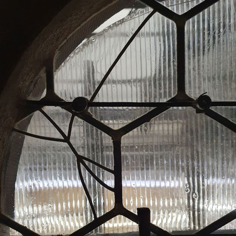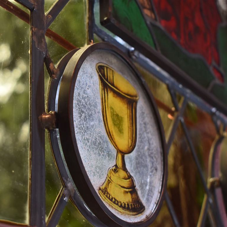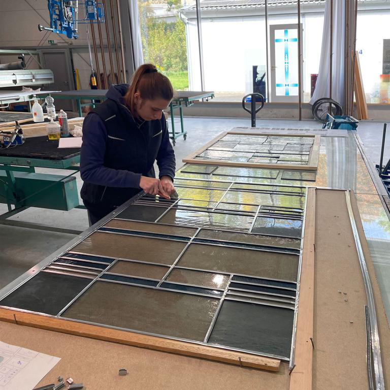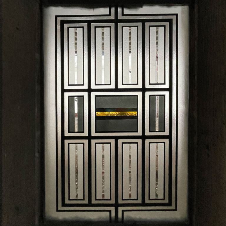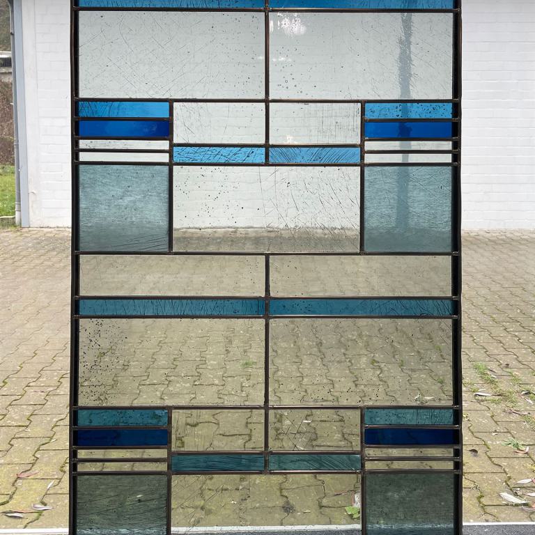 Bleiverglasung mit Silber belegt. Zu Isolierglaseinheiten verarbeitet.