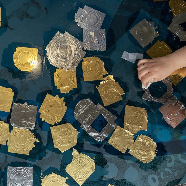 Hand- und Airbrushmalerei auf Sicherheitsglas. Partieller Auftrag von Blattgold.