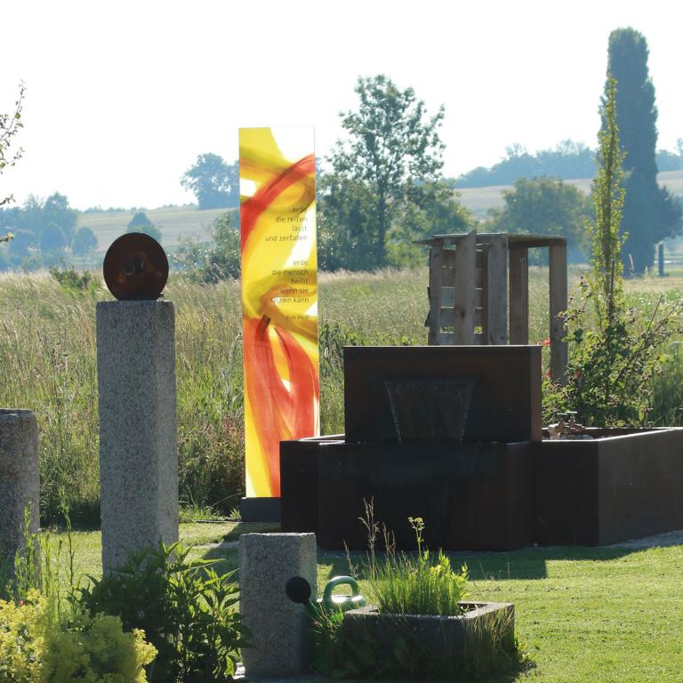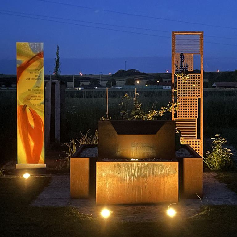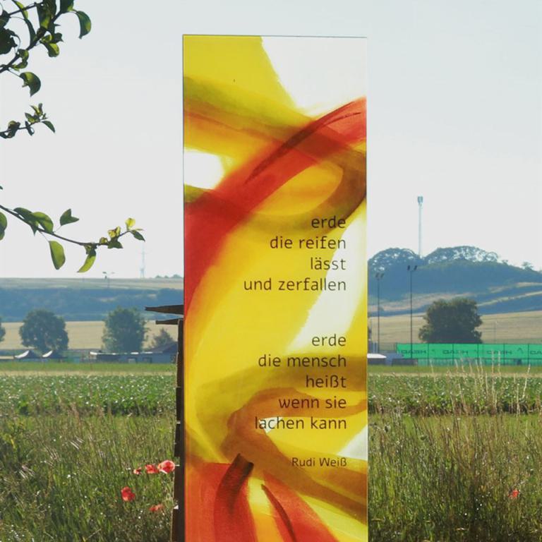 Der Entwurf der Künstlerin wurde mit keramischem Digitaldruck realisiert. Die malerische Gestaltung spürt dem Gedicht „Erde“ von Rudi Weiß nach und interpretiert es im Kontext seines Standorts.