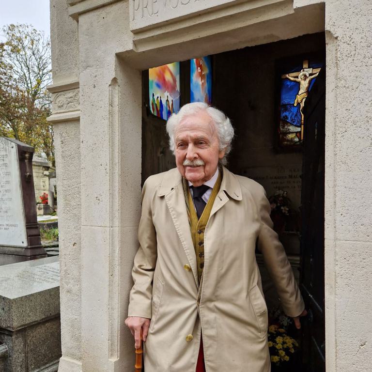 Privatkapelle Cimétière Père Lachaise, Paris, 19.Jahrhundert. Restaurierung des historischen Friedhof Kapellenfensters in Kombination mit neuen Fenstern des Künstlers Malel.