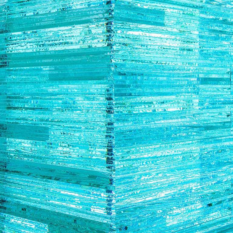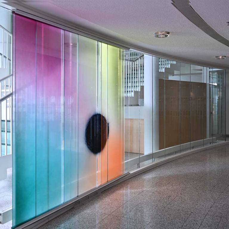 Beschreibung: Ein mäandrierendes Netz aus utopischen topografischen Strukturen verschmilzt zu einer imaginären Landschaft. Die Wechselwirkung von Licht, mehrschichtiger, emaillierter Farbigkeit und Transparenz spielt mit der Wahrnehmung der Betrachtenden. Verbundsicherheitsglas mit innenliegenden keramischen, eingebrannten Farben.