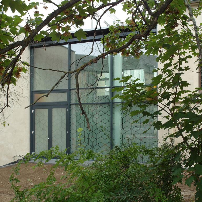 Opale und transparente Echt-Antikgläser, auflaminiert auf eine Floatglasscheibe