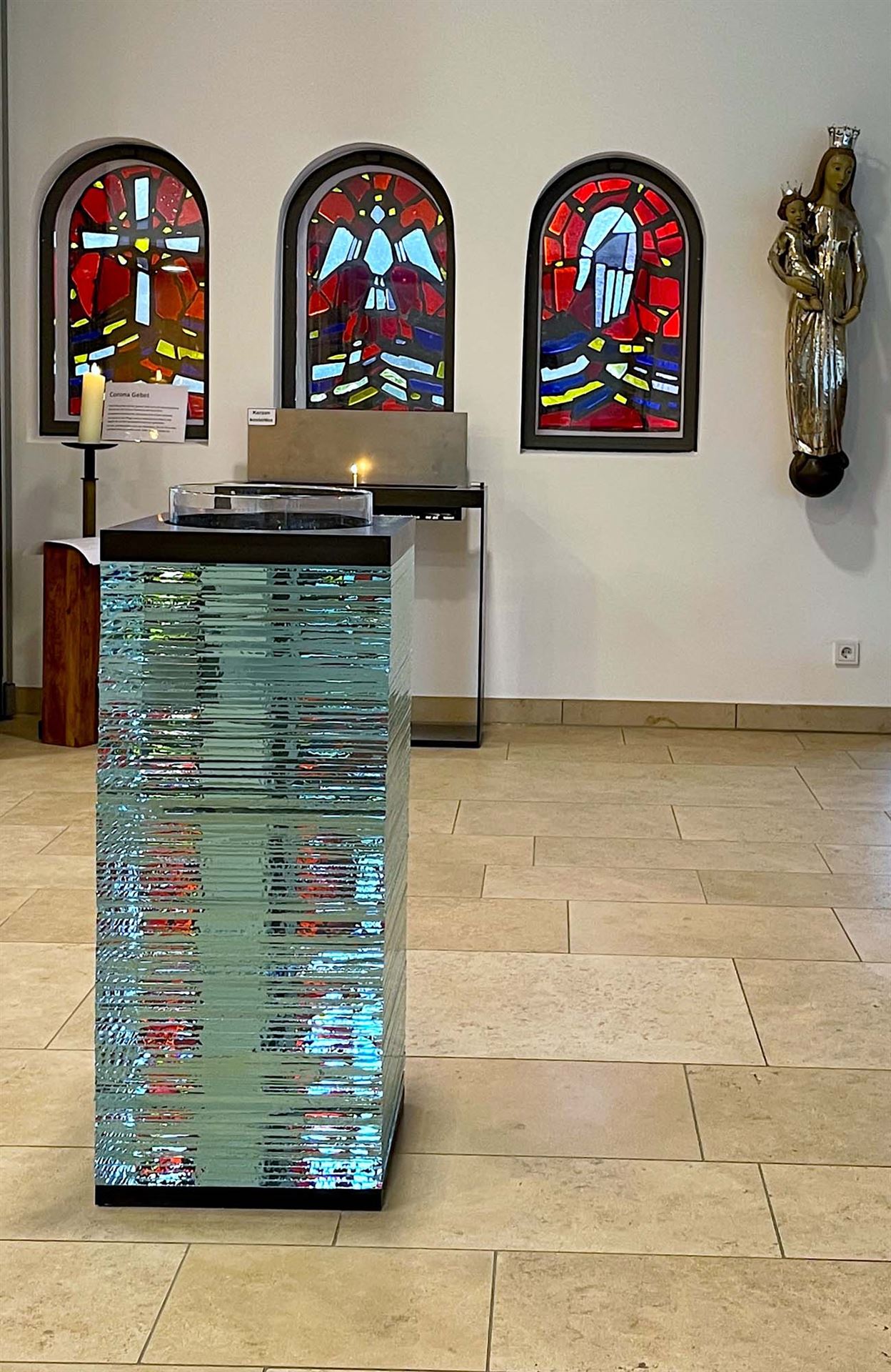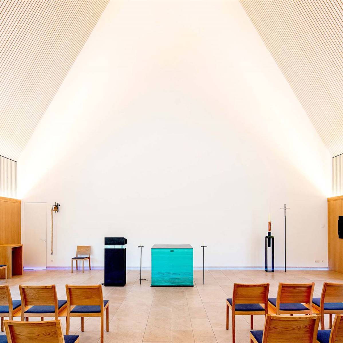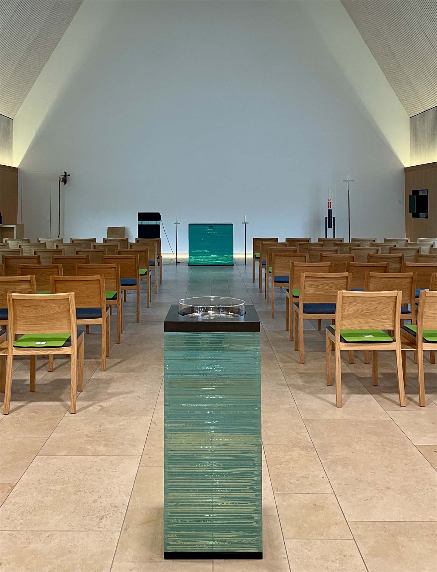 Diese Glaskörper nehmen jeden Lichtstrahl auf und brechen ihn vielfach. Wie eine Wasserfläche im Sonnenlicht schimmern sie und spiegeln Reflexe in den Raum. Im Altar zeigt sich eine Binnenfigur: ein Kreuzzeichen, das durch die unterschiedlichen Formate der Glasscheiben entsteht.