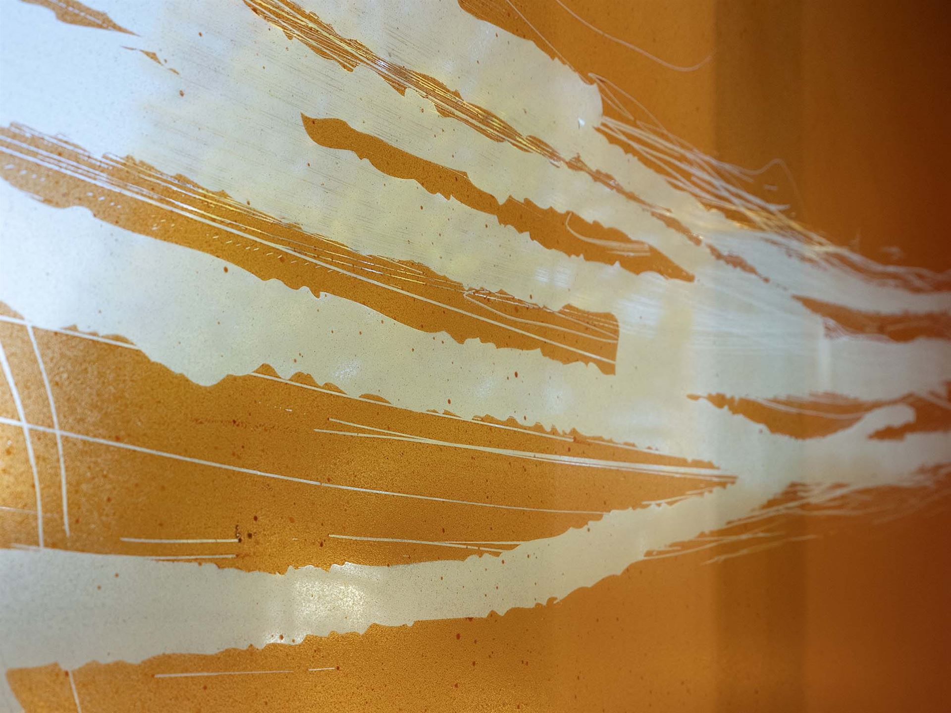 Sabine Straub entwarf die farbige Gestaltung der Scheiben mit Glaseinbrennfarben, die sich über die gesamte Straßenfront und die großen Schiebetüren zum Kirchhof erstreckt. Feine Farbnebel mit herausgekratzten Linienzügen bestimmen die Gestaltung. In den Seitenzonen sind sie dezent und luftig in Weißtönen gehalten und verdichten sich zu einer Farbexplosion in kräftigen Rotorangetönen an der Gebäudeecke. Die Ritzungen und Linien erinnern an Sgraffito, an Ritzzeichnungen in Putz- und Hauswänden. Sie erzählen eher beiläufig und skizzenhaft von christlichen Motiven und Symbolen. Die kräftige Farbwahl bezieht sich auf die Wandmalereien in der Kirche selbst, die 1930 im Stil des Spätexpressionismus in starken Rotorange- und Rotviolettönen ausgemalt wurde.