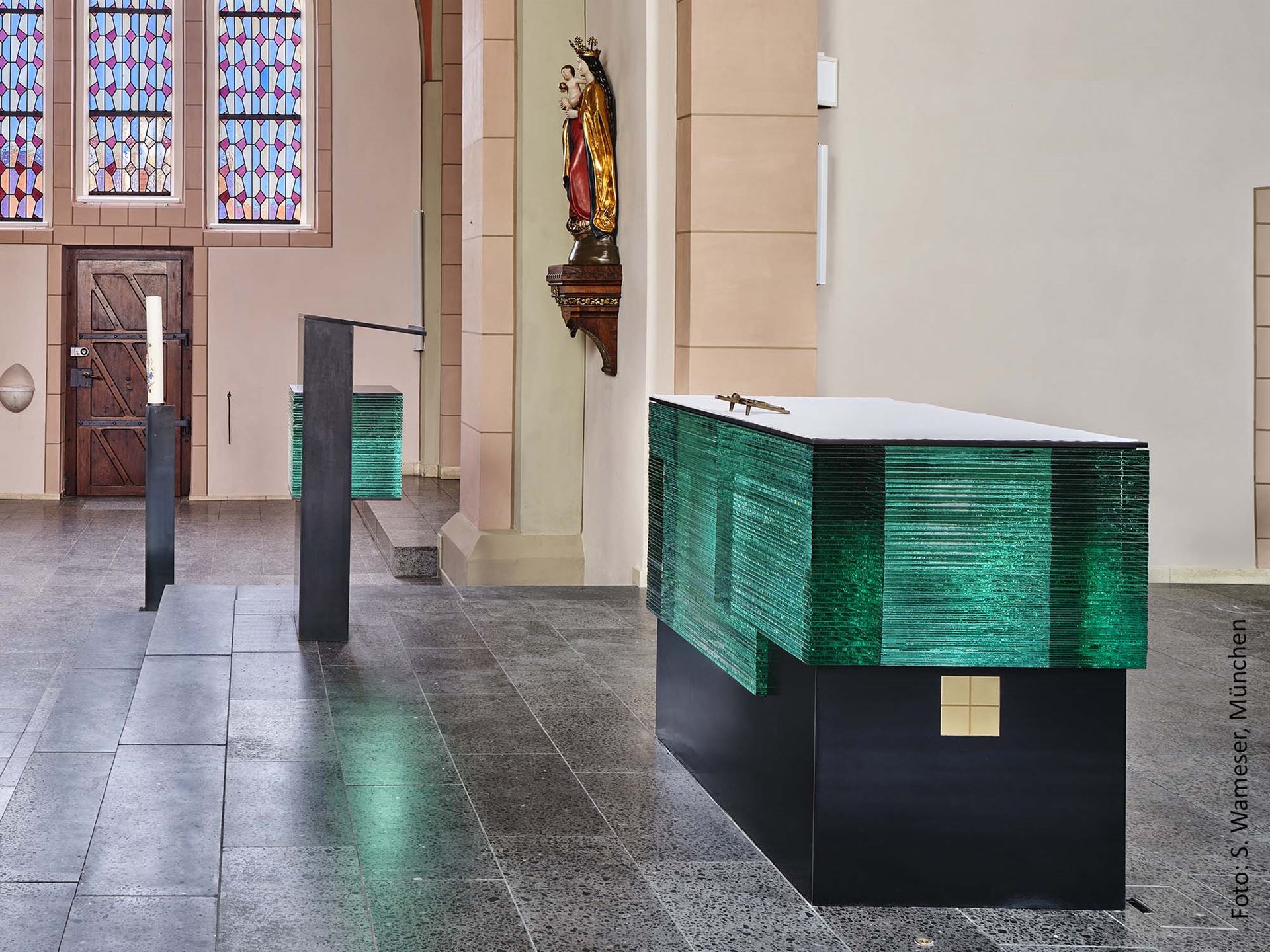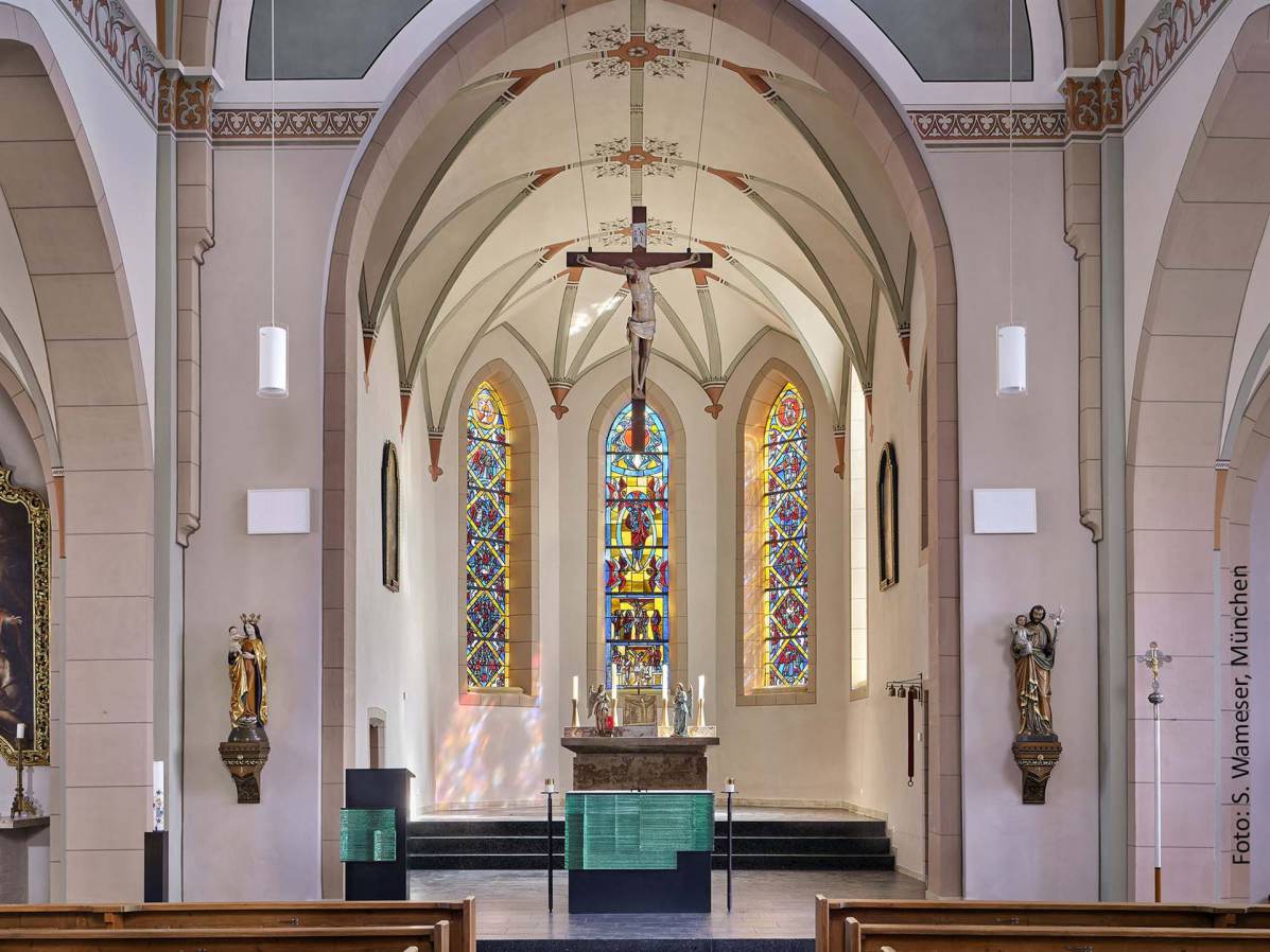 Die Kirche St. Georg ist geprägt von farbigen Glasfenstern im Chor und Langhaus. Die Künstlerin Sabine Straub greift dieses Thema auf und gestaltet Altar und Ambo aus gläsernen Blöcken, die Licht bündeln, streuen und in Spektralfarben auflösen.