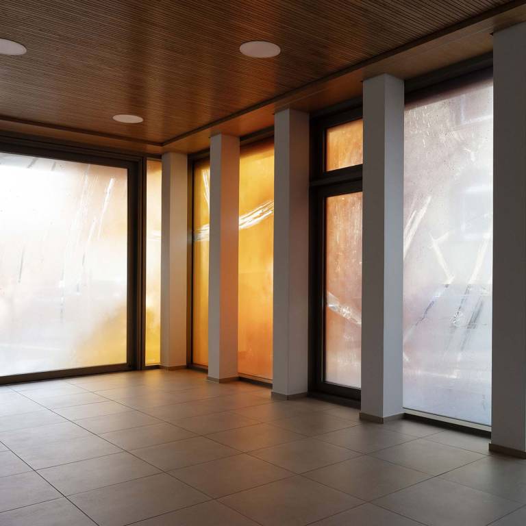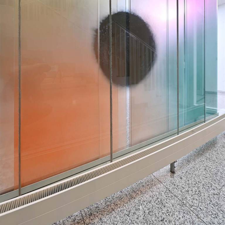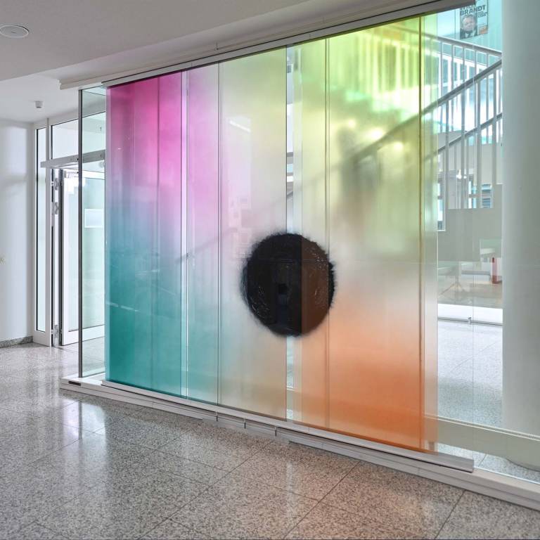 Beschreibung: Ein mäandrierendes Netz aus utopischen topografischen Strukturen verschmilzt zu einer imaginären Landschaft. Die Wechselwirkung von Licht, mehrschichtiger, emaillierter Farbigkeit und Transparenz spielt mit der Wahrnehmung der Betrachtenden. Verbundsicherheitsglas mit innenliegenden keramischen, eingebrannten Farben.