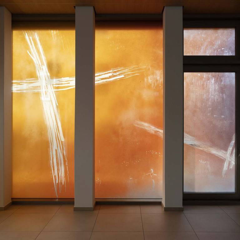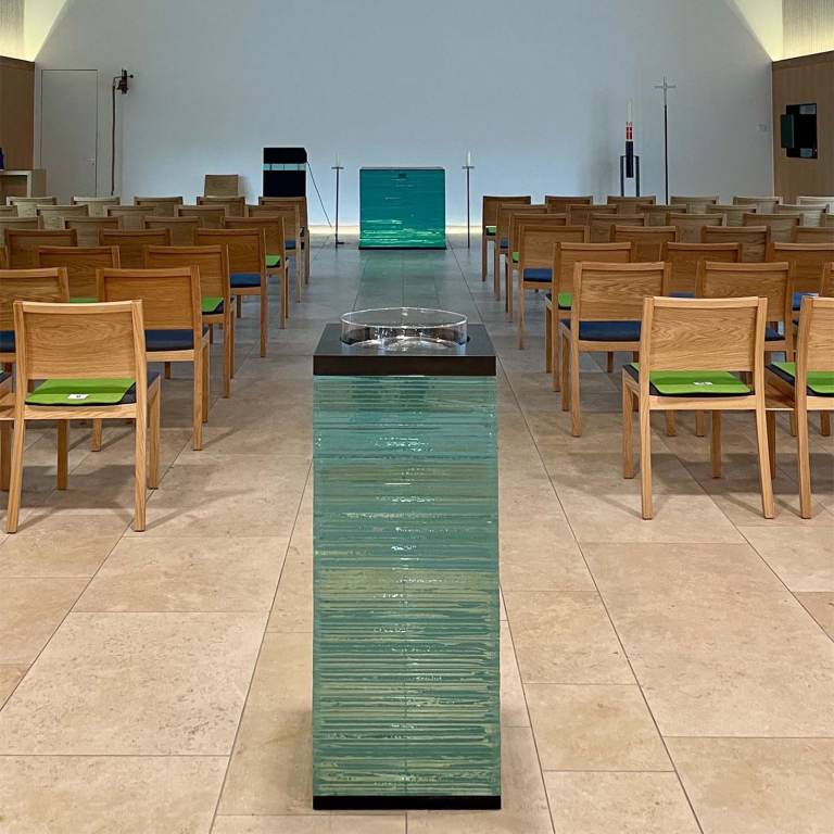 Diese Glaskörper nehmen jeden Lichtstrahl auf und brechen ihn vielfach. Wie eine Wasserfläche im Sonnenlicht schimmern sie und spiegeln Reflexe in den Raum. Im Altar zeigt sich eine Binnenfigur: ein Kreuzzeichen, das durch die unterschiedlichen Formate der Glasscheiben entsteht.