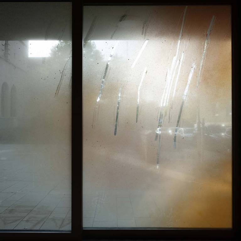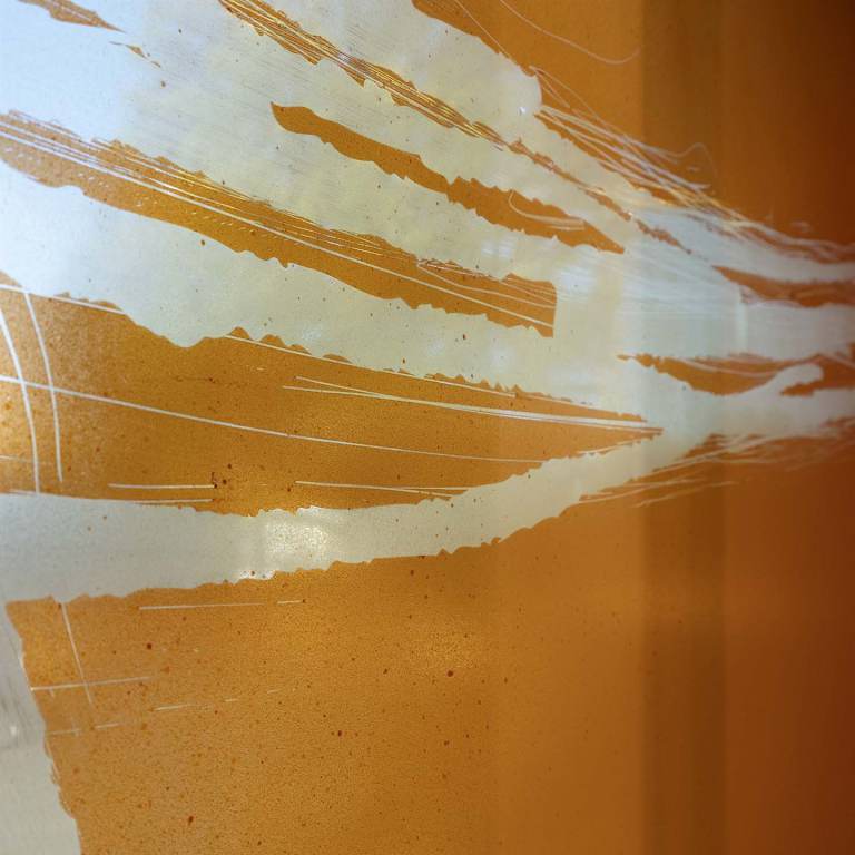 Beschreibung: Der mehrschichtige, malerische Farbauftrag mit keramischen Schmelzfarben und Silbergelb wurde gemeinsam mit der Künstlerin in Airbrush- und Handmalerei aufgebracht und bei 620 °C eingebrannt. Feine partielle Mattweißüberzüge verstärken die Wirkung in unterschiedlichen Lichtsituationen und ermöglichen farbige Lichtprojektionen.